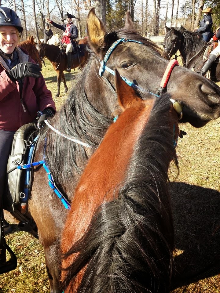 We had some good Greenie experiences today! Going out behind a large group – waiting nicely at the trailer for our buddy, not race brain “lets go get em”. We went out with just one other friend – through some very windy trees and along side cows, with other horses in the distance and in no rush to catch them. We went back to the parking area to pick up a map and head out on the ‘real ride’ and ended up having a pony cart behind us. We stopped to face it but Tesla was worried enough backing up at high speeds that I just decided it best to get off and keep him still as they passed. 2 cute little Dartmoor ponies pulling a cart with jingle bells. We then proceeded to hit the trail and chase said pony cart and check it out. We went past them just fine and put enough space between us at a trot (or some gait) to ease his & his buddy Stryder’s mind to continue on 🙂