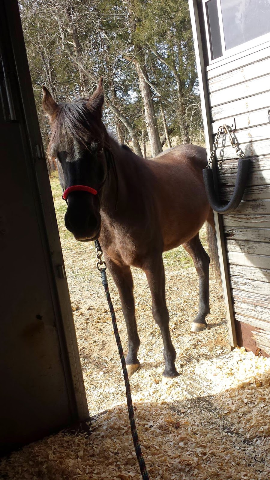 So when did I hit the road finally? about 1pm…. The trip itself was uneventful. Other than the first few minutes of sitting waiting for me to drive off, he was quiet. We only had an hour drive, so it wasn’t a big deal to be leaving that much later in terms of daylight. When we got there he walked off, fairly ungracefully stepping out of the trailer, no worse for wear and right to the grass of his pasture to munch. He quickly came over to say hi to me & the trainer as he a bit of a puppy dog 🙂 All is forgiven? Loading is one of the big items to be worked on! My trailer is put back together as a 2H straight load with a divider and left with him.