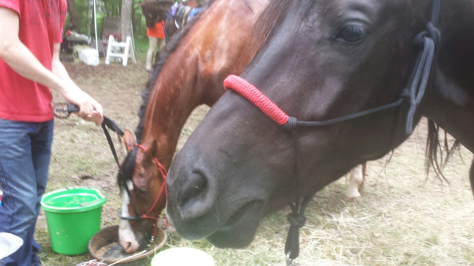 We continued to cool off, he chowed down on his grain & supplement mix (yay!) and some hay and relaxed for a bit of our 30min hold. James was there crewing for Kristen and they were nice enough to share carrots and apples and hay (as Tesla decided his own wasn’t good enough) with us. These two geldings really ‘bonded’ and Tesla was able to provide that “hey do this (eat/drink/etc)” to Flash on his first ride.