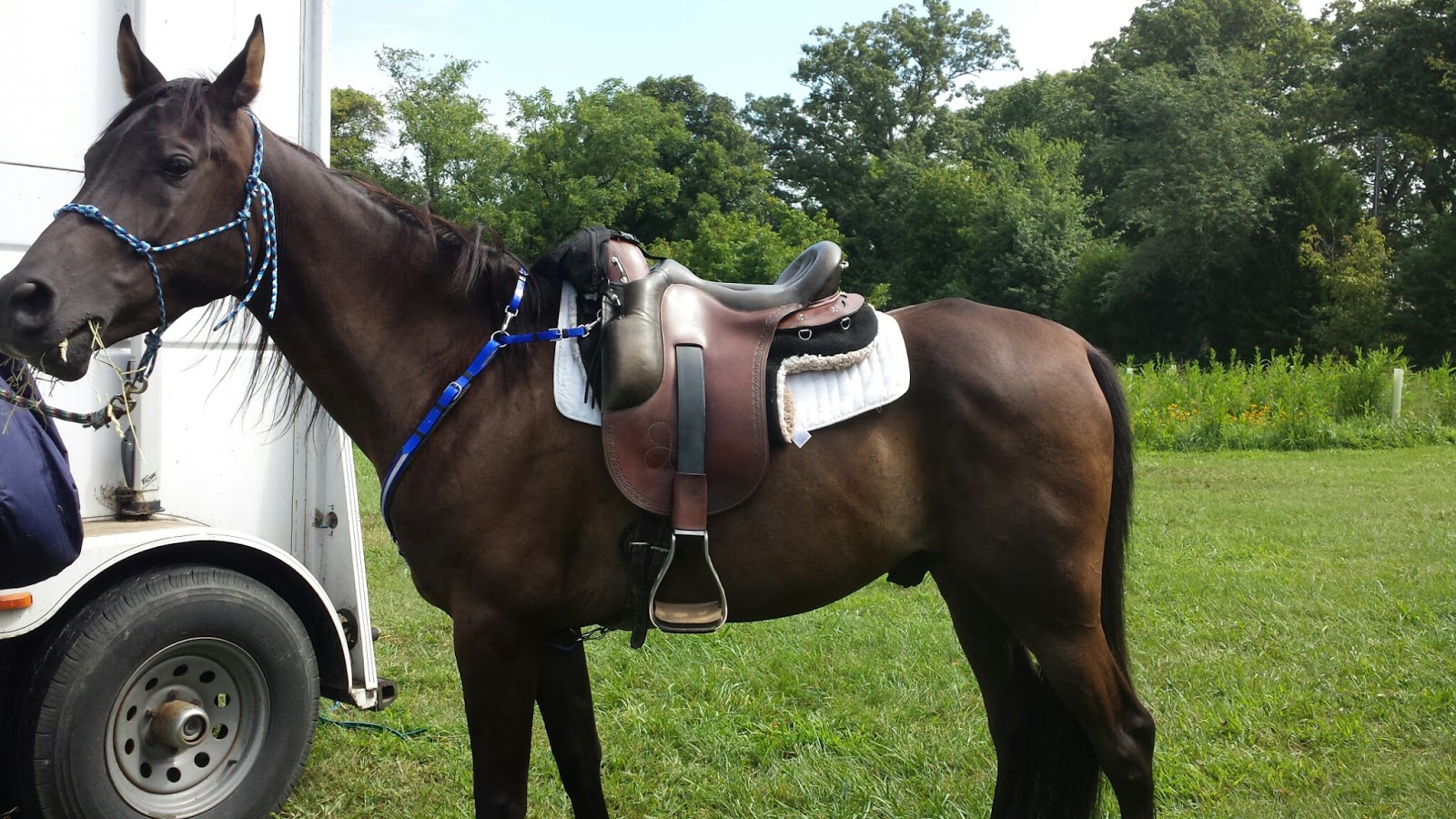 We got to the park, he did pretty well tied up for tacking – calmer once I put his hay bag up. Today we tried out one of my other mentor’s saddles he is thinking of selling…and Ortho Flex Endurance. It was neat to see the panels/booties moving with Tesla’s shoulders through the pommel area. Once I got the stirrup length and girth figured out we were good to go. He offered no bucks and my rear and knees were way more comfy than in the Specialized we tried last weekend. I think the seat might be a little big for me, but I need a 15″ to compare to! We had a great 9.5mile ride, with two HUGE spooks that I stayed in the saddle for…granted the second one really got my chest hurting again as I held on for dear life, but I stayed on! lol The rider behind me was surprised as he apparently teleported to the left quite aways and fast 😛