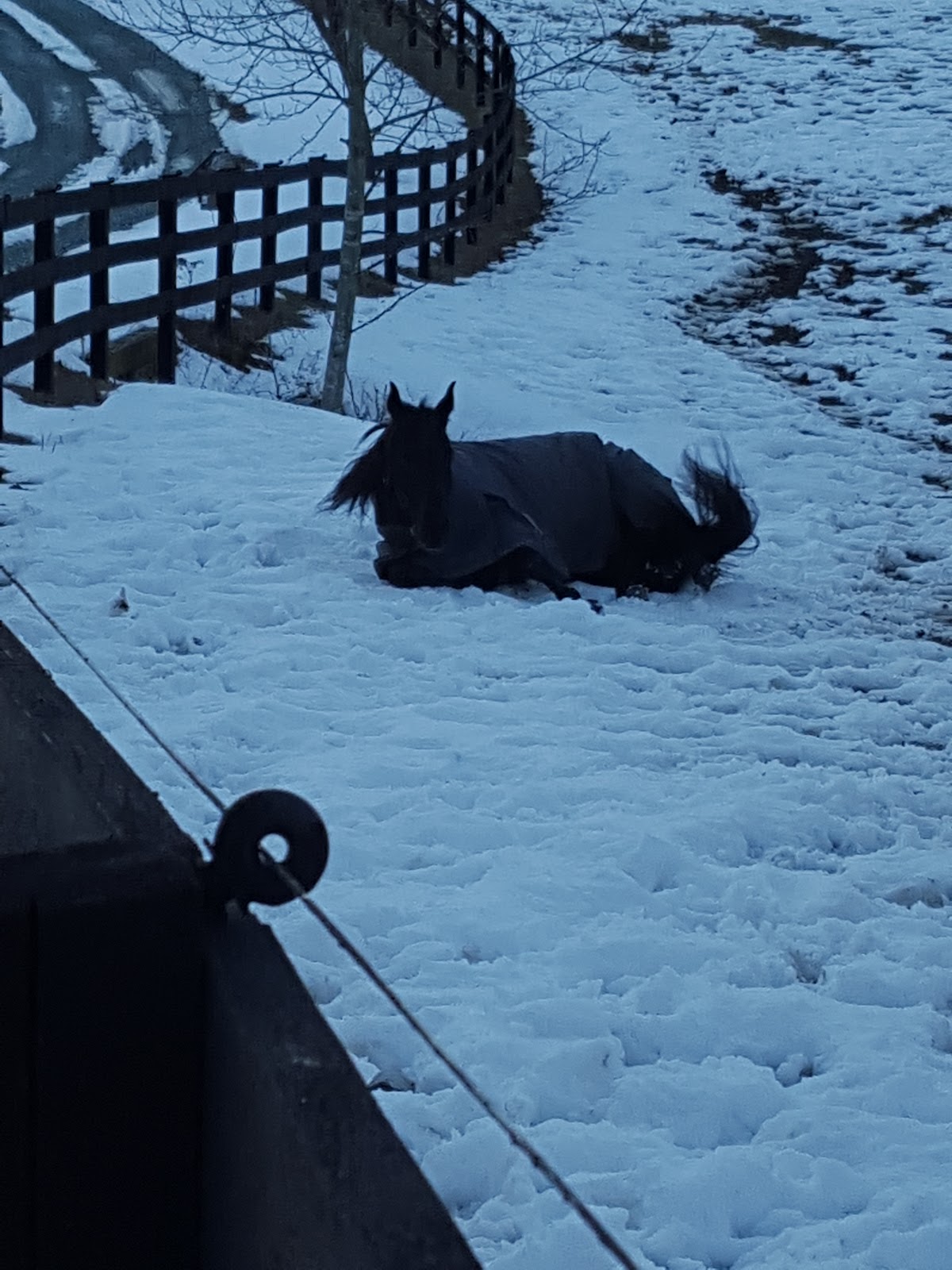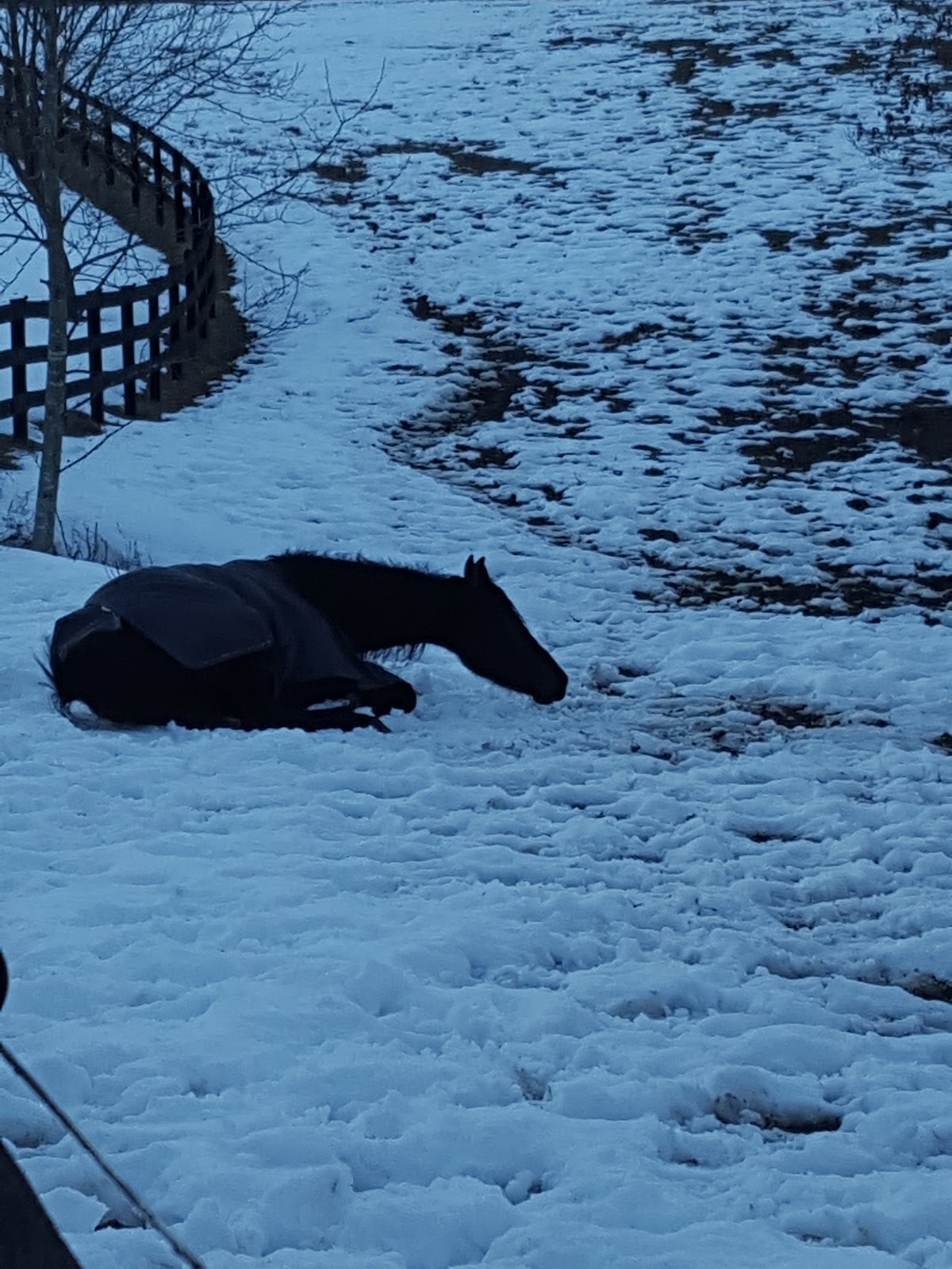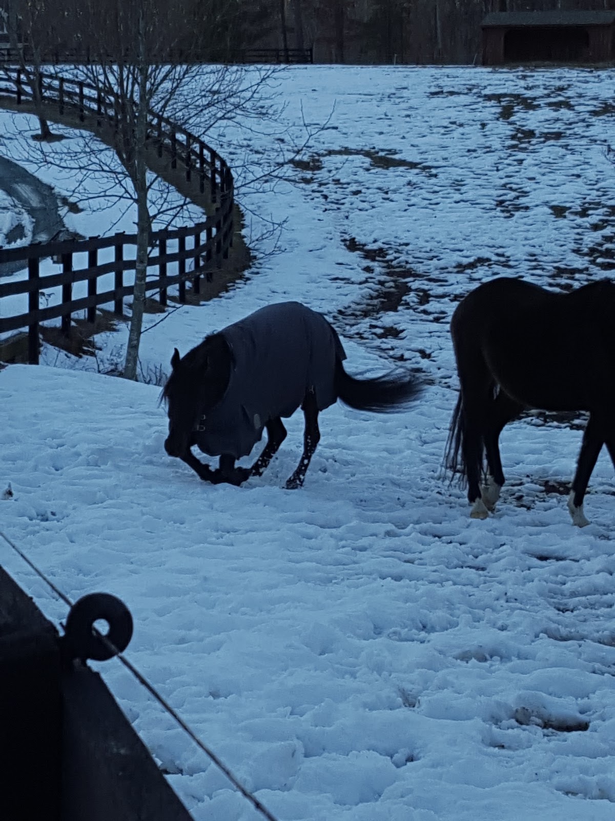 And off we went, spooking at everything! shadows? yep. trees moving in the wind? yep. a pile of snow? yep and that one was a stop with almost a roll back…but the next two snow piles just got a sideways glance. We walked around and up the driveway, then down some of the ATV tracks to the other side, back past the snow piles with no reaction, so I decided to change directions. Everything is so much scarier coming from the other direction right?! Actually it wasn’t but we had 10min discussion about the fact I wanted to go straight and not back up the driveway after he drank from some water from melted tire tracks (got lots of good boys for the drinking). He pulled a “pop the head way up and hope to smack you in the head” move, but I am now riding with a running martingale so that was a 1 time “damn!”… next let me “bend my nose and sidepass the way I want to go”. So I backed him the direction I wanted to go until we could turn and move past the stuck point & forward. Then when I finally decided we could head back to the barn we fought to stay at a walk and did a few circles in the yard to regain composure. More “bend my nose and sidepass” moves and eventually walked back through the gate into the arena. I asked him to do a few walking lunge circles around me again to focus and then we called it a day…. 45min or so…Probably only a 0.5 mile in distance, although those walks around the arena add up quicker than one might think, but I didn’t turn on my tracker so I can only guess.
