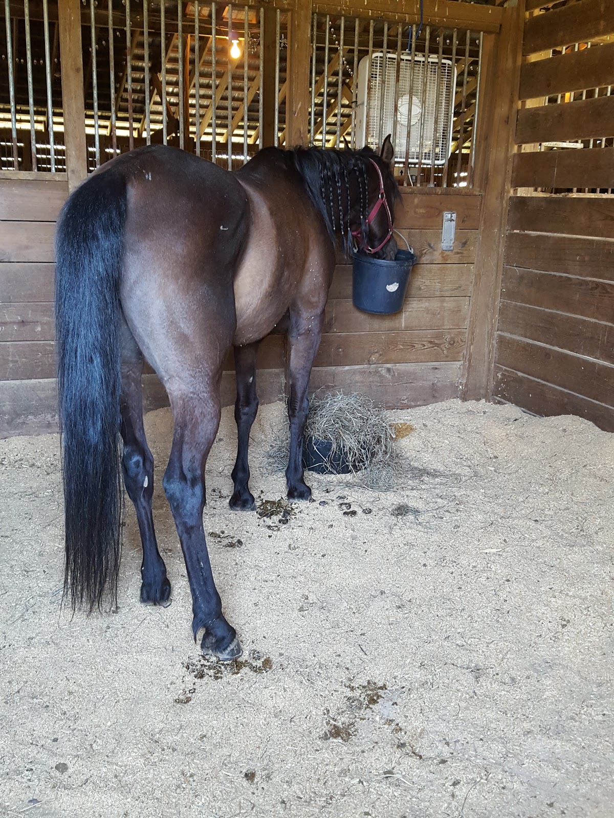 The vet arrives as promised, we discuss as he checks vitals. Fever had increased over the last hour, but still not exceptionally high.  We offer him some grass, which he has no interest, then move to tubing him.  No impaction noted, he was given banamine and bute, and perked up within a few minutes. The vet left with orders to monitor the fever, let him hand graze as long as he wants in the shade, and if he looked ok keep him in a small paddock overnight, no grain. Grass and hay only.  We grazed for a bit, he was noticeably happier and more alert, after about 15 or 20 min he wanted back to the stall for water, a welcome sign.  I left there with his fever continuing to diminish, and him lightly munching hay. The barn owner to follow up on the temp monitoring and keep me in the loop… The vet did not feel he was a critical case and we both thought this would resolve quickly. Blood was drawn to be run in the morning looking for signs of infection, and if none seen moving on to a Lyme test.