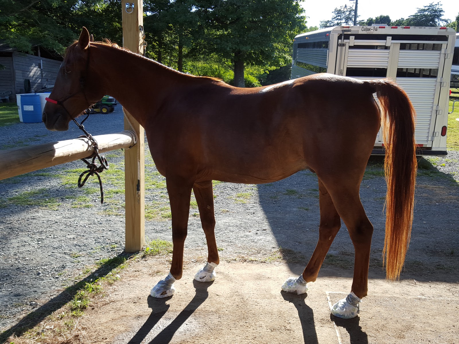 His feet were a bit overgrown, as I knew going into this. What we discovered once getting them trimmed up – White Line Disease on all four. Forest cut notches in the toes and cleaned them out, left me with instructions to soak as often as I could to keep them clean, and we will put him on a 3 week trim cycle (since the farrier is at our place every 3 weeks anyway). It will take 6-8 months to be completely grown out, but he has good solid feet overall.