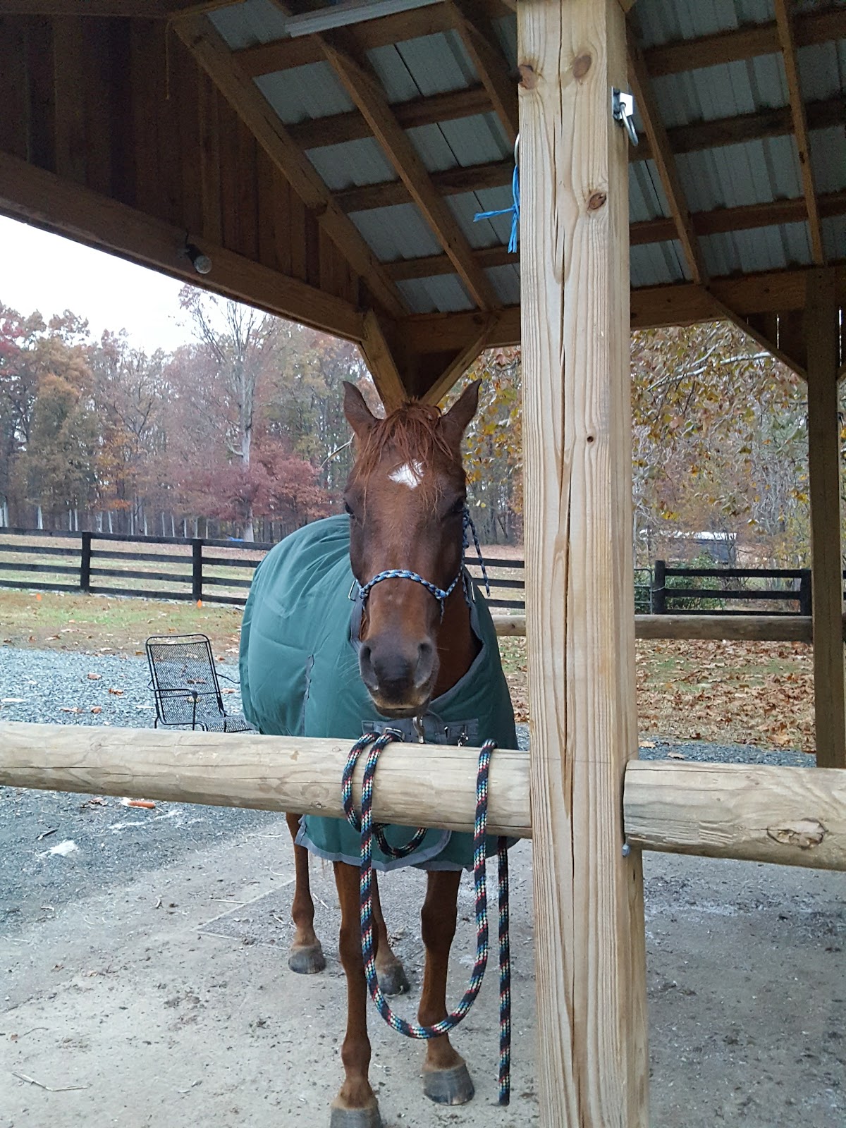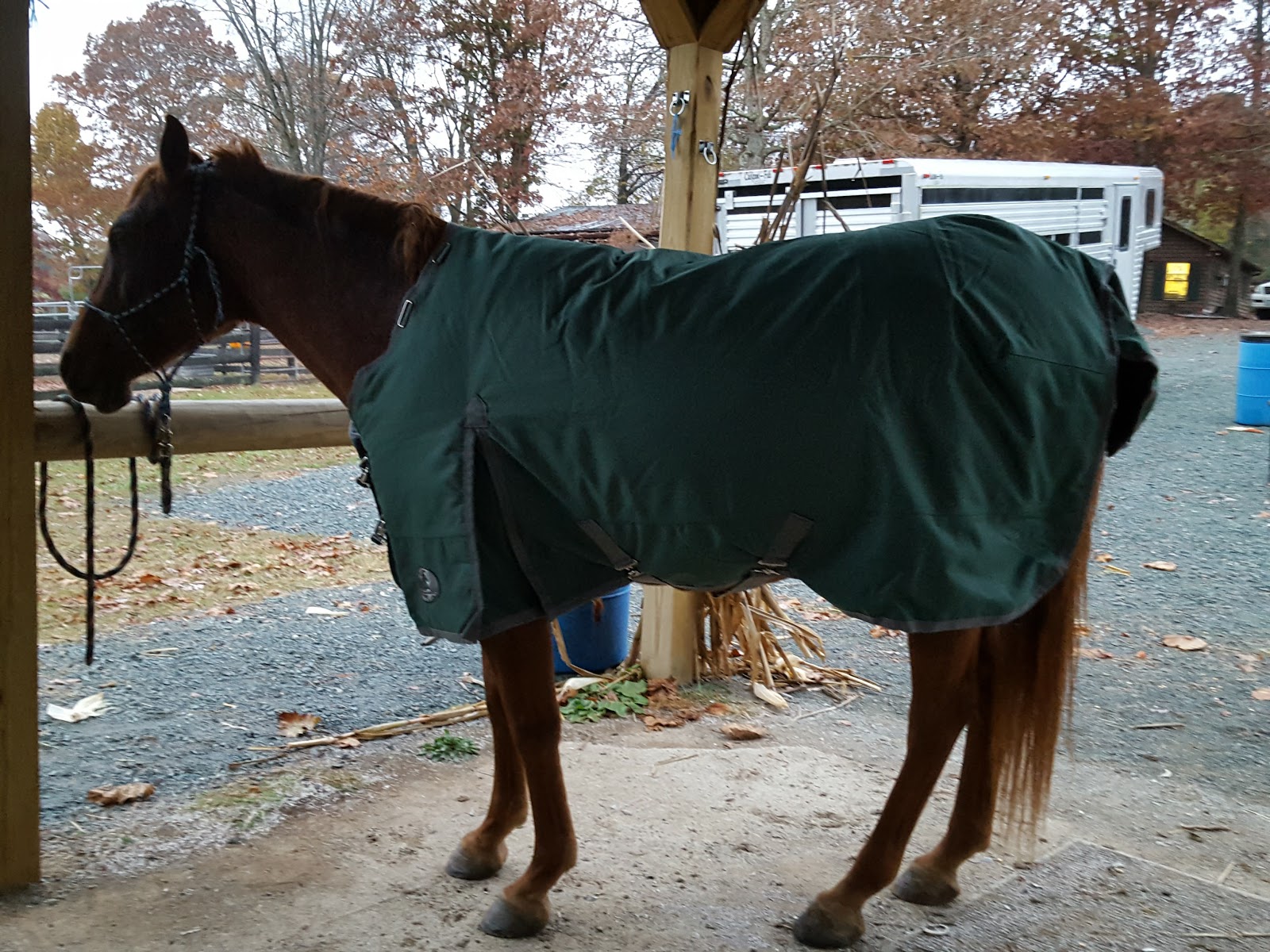 Prophecy will remain in field board. He has a good fuzzy coat, and is obviously at a good weight…so unless he is shivering I will not be likely to blanket him (maybe the winter cold will help him shed some pounds keeping warm!). He does have a lightweight now, and got to try it out earlier in the week due to a cold night with rain expected. He was much less worried this time about getting it put on, maybe he wanted it? It was kind of funny to see his expression as he walked off in it, but settled into wearing it easily and it stayed on without any rubs overnight 😛 (or undressing attempts by his pasture mate)