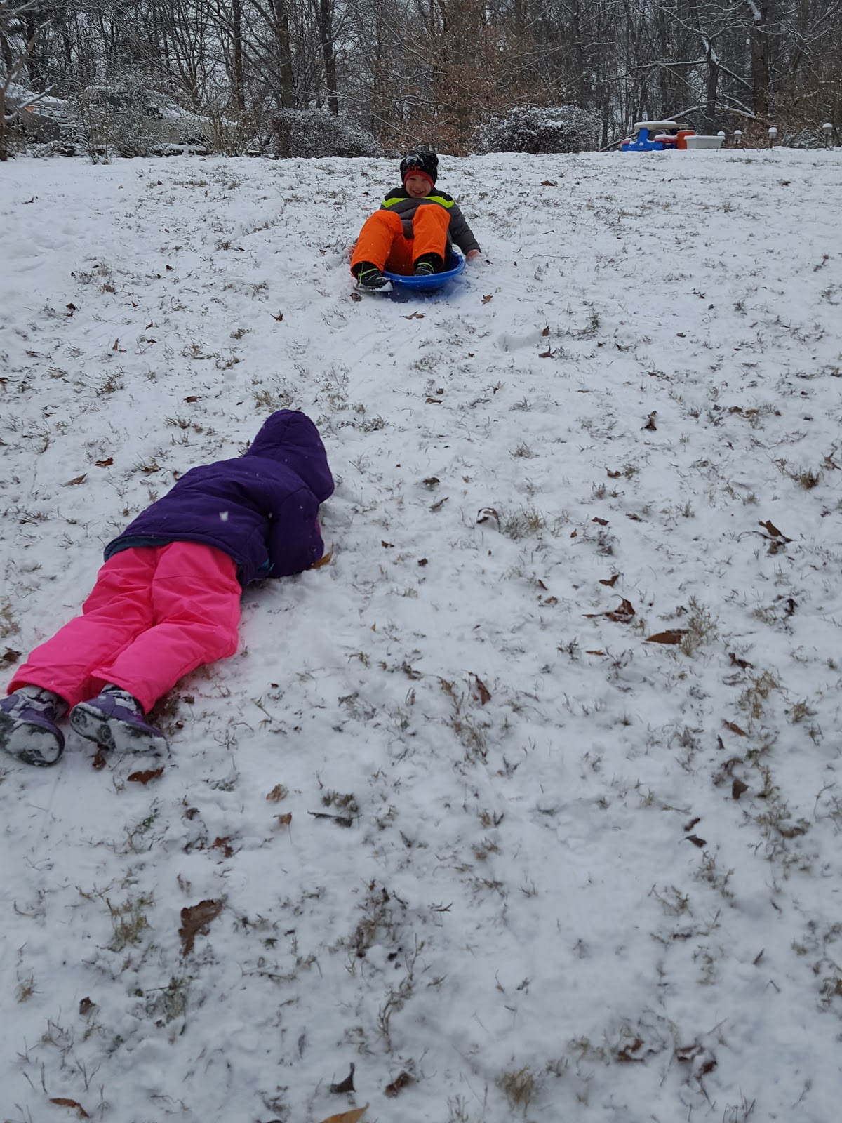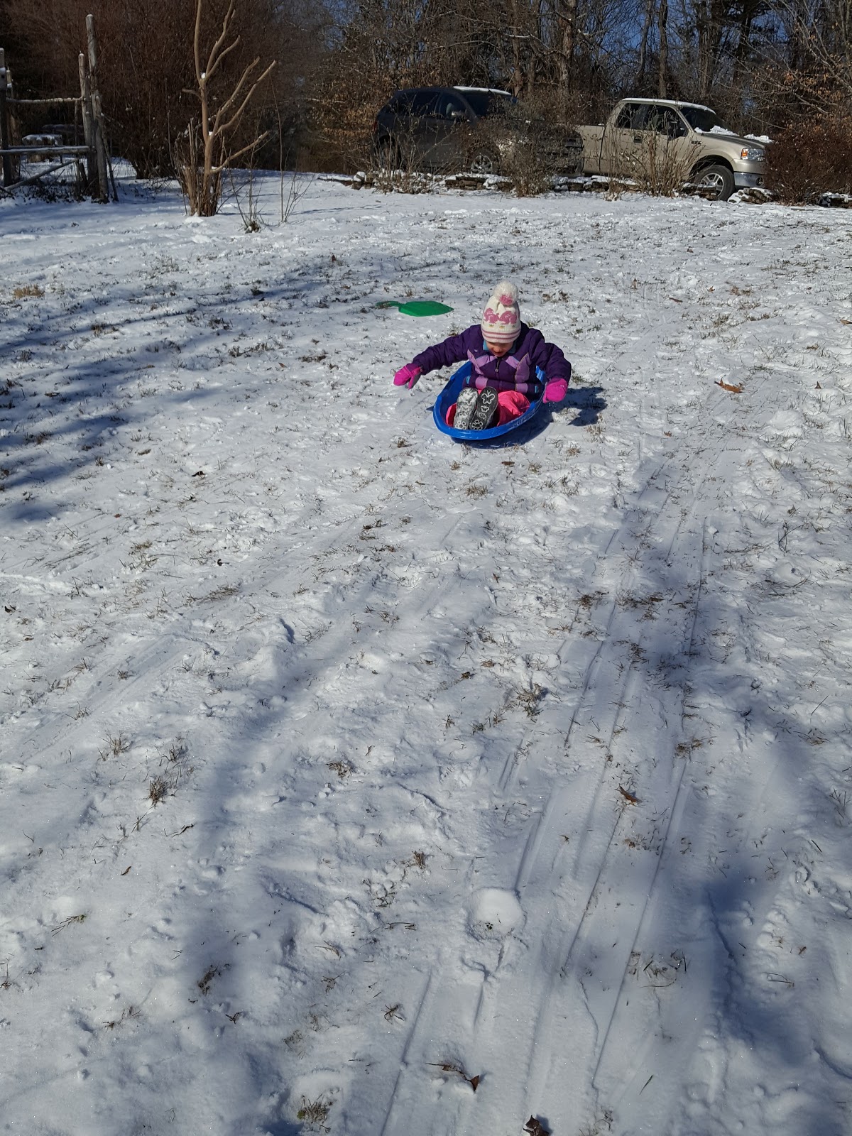 The snow storm, while it trapped us at home, did make for some fun sledding on our little hills at the house. Skyler is a speed demon and hard to catch at the bottom (so she doesn’t hit a tree!). Asher had fun purposely running into logs and wiping out