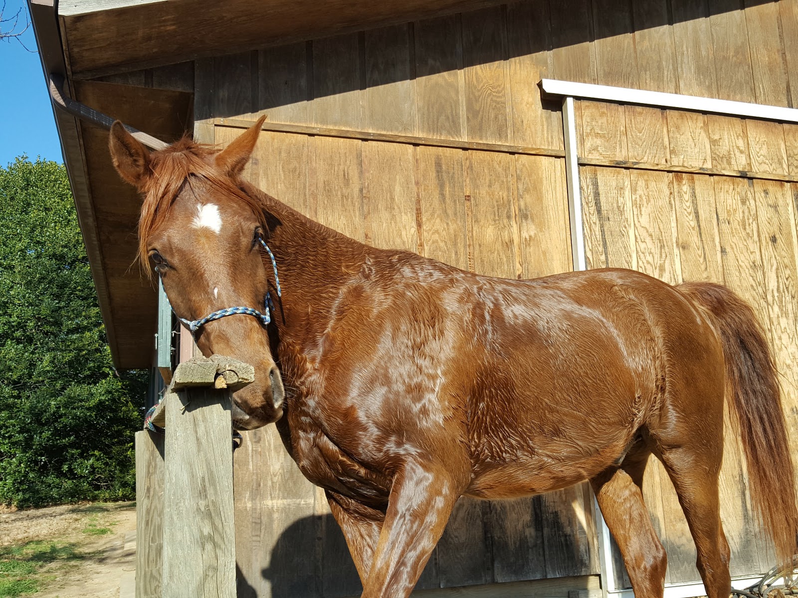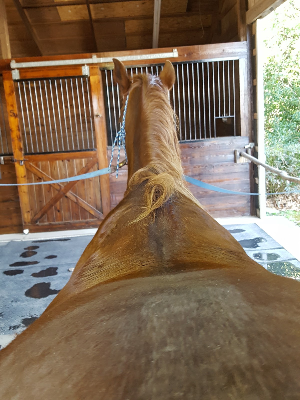 The ride Sunday unfortunately did not go as I hoped. He was quite the argumentative one and threatened to buck many a times. So, we finished the loop that I started him on and then did some round pen work. He was sweaty after that, so given the nice weather he got a hose down! He has made me think about sending him back a trainer for a refresher, but this is the first “bad” ride we’ve had alone. This ride is coming on the heels of the two past rides with horses that spooked and sent him into a tizzy, so I may be having some regression of his confidence out there alone.