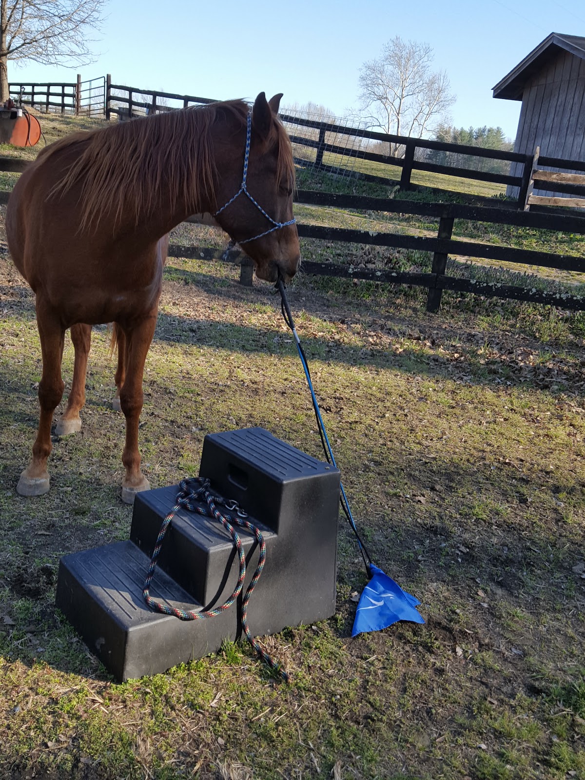 I had absolutely very little of his interest.  It wasn’t that he wasn’t paying me attention and that it was elsewhere, he was actually very “sulky” and grumpy, not even trying to look at me, but also not focused on anything outside the pen. He would just stand and look grumpy when stopped.  I changed my tactic and just sat on the block waiting for him, yet he just stood, sulking, looking somewhat off to the side but not at anything, head lowered. I even left the pen (and took this pic) with no interest from him.  Highly unusual – this being the horse that picked up and brought me his line not even a week before and loves to knock over the block trying to pick it up.