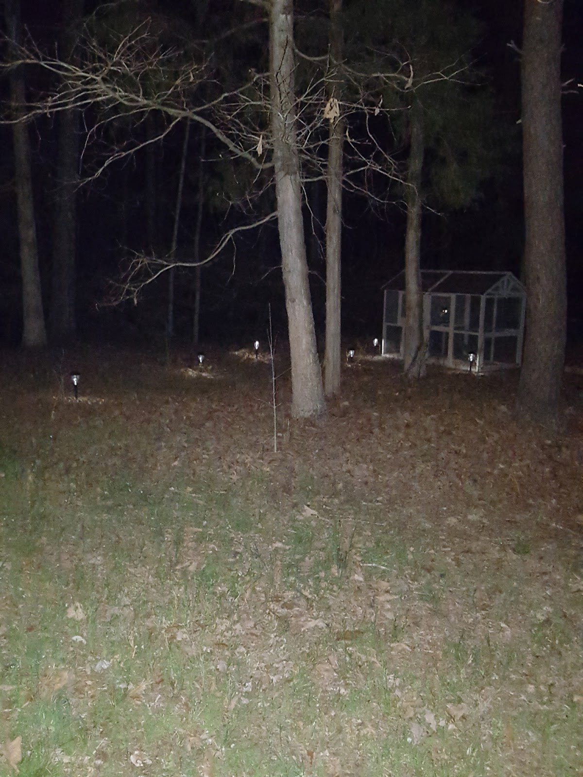 We built the coop Saturday, but the night was expected to be pretty cold, so waited till Sunday to move him outside. We added some solar lights from Lowes to illuminate the path – $12 for a pack and they are pretty bright!