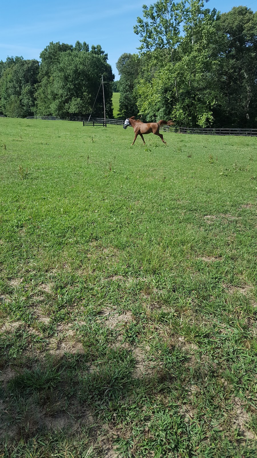 I visited on Sunday morning and cleaned his feet, took a few hoof pictures and somehow forgot to measure his hind feet for boots again! He got lots of scratches with grooming and time with the BOT pad. As soon as I put it on, he started yawning and licking and chewing, I’m sure it feels good! He got a little antsy at the end, when I turned him out discovered the why – he had to pee! Then he took off through the field, and came trotting back to me after a drink. So I decided to play and took off jogging and he came right along behind.