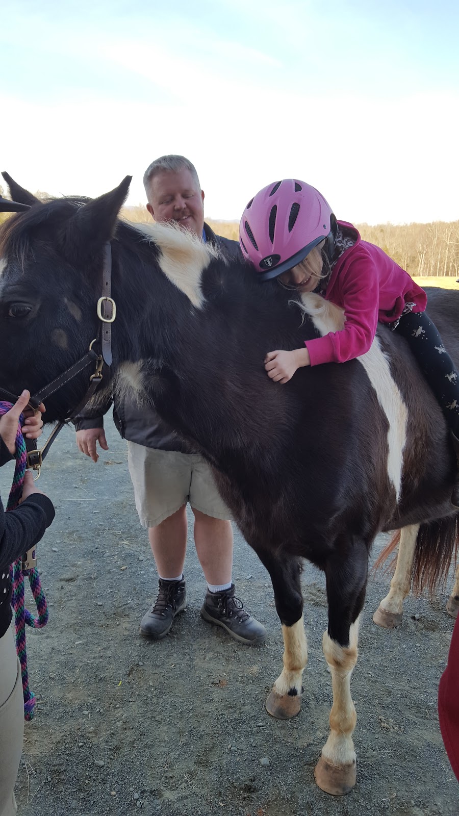 In my hopes to find a sport that Skyler takes an interest in, I took her to the barn for her first “riding lesson” as we were over 60 degrees last weekend! She had a blast grooming and ‘riding’ Magpie, getting to meet a bunch of the horses that live there, and some foals at the farm across the street. She even learned how to handle some mucking!