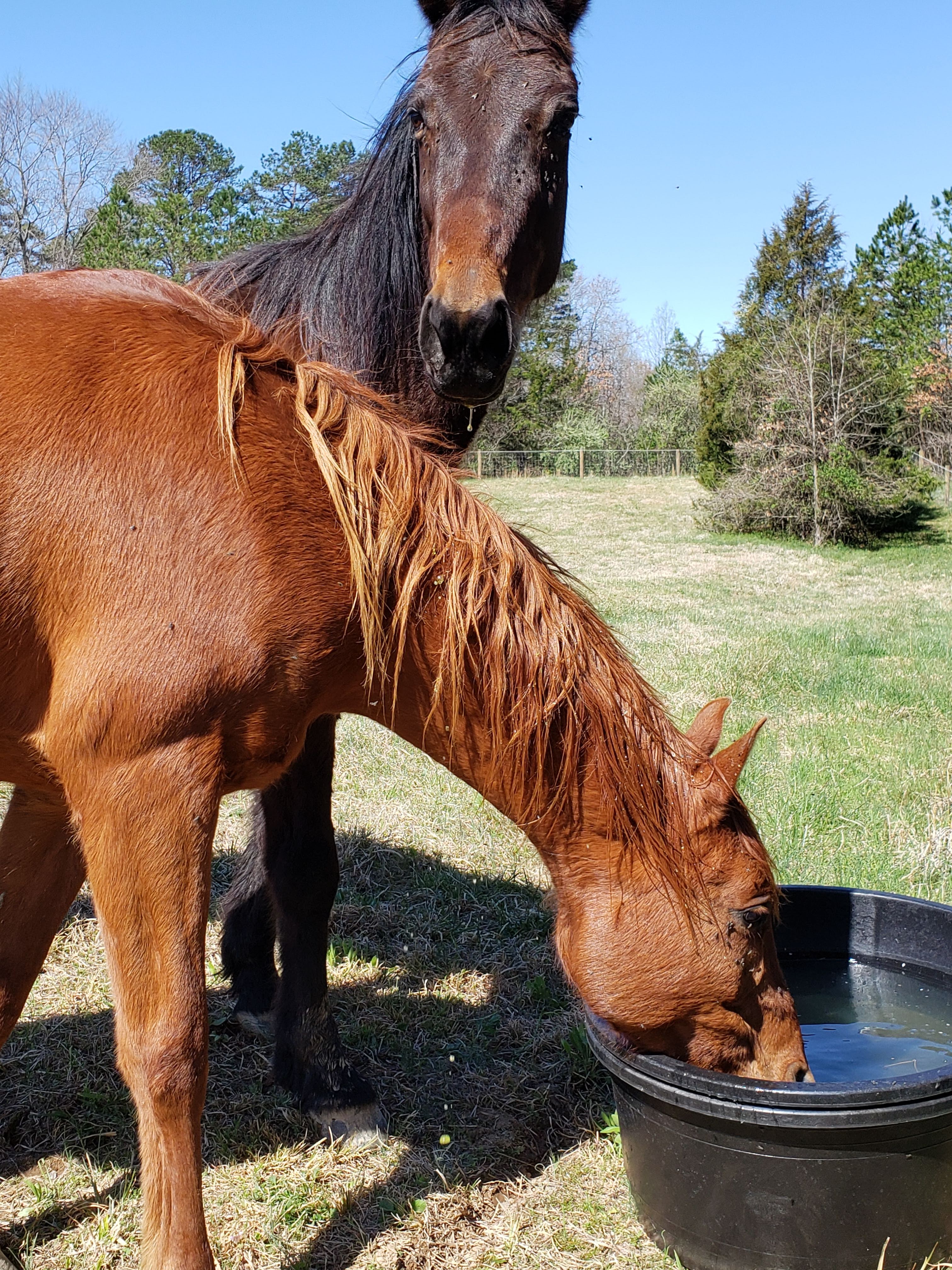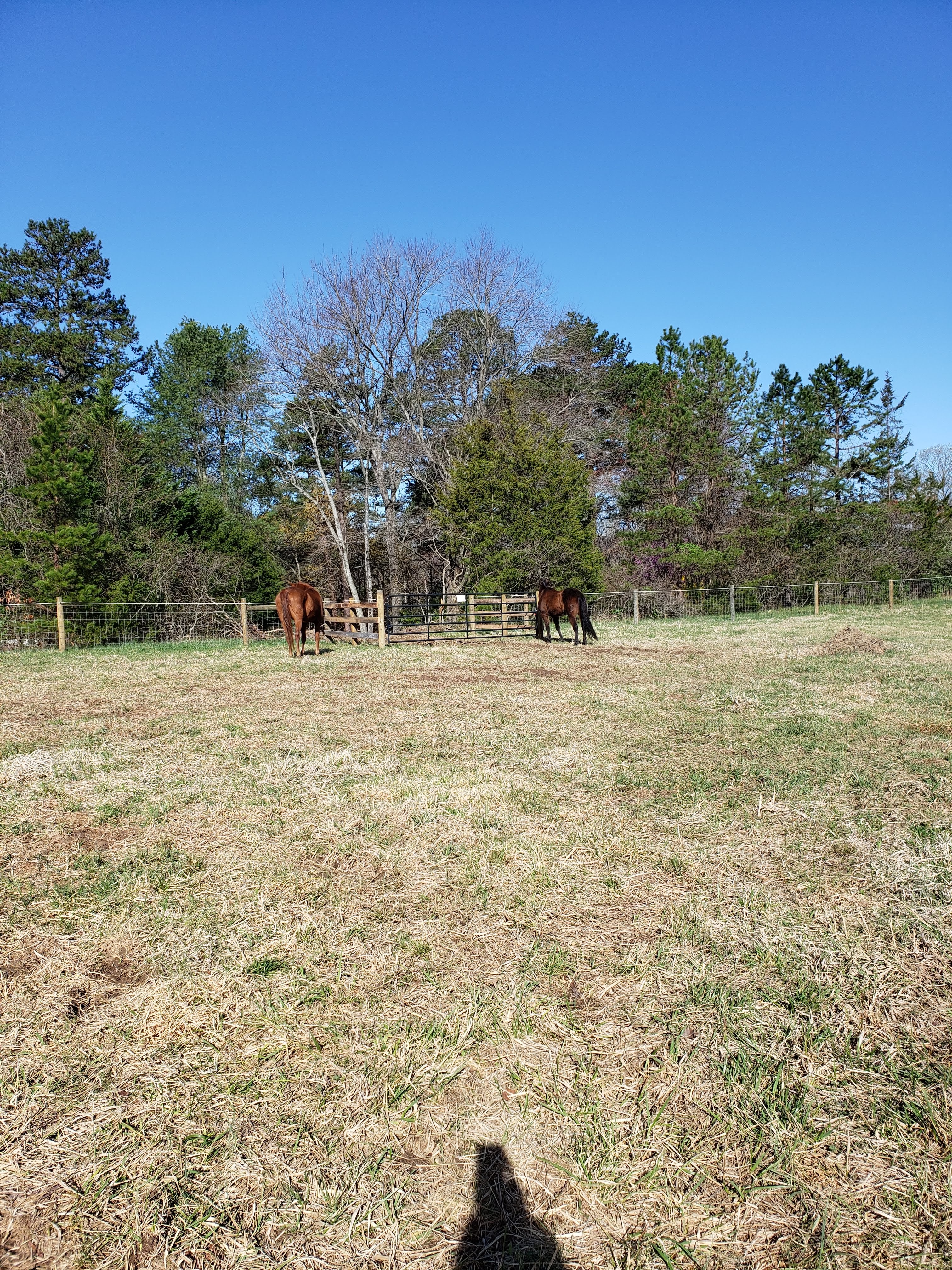 On that note… Something I’ve been waiting for over a year now has finally happened! I have officially moved Sully & Prophecy to be on a leased pasture next door so they are HOME! We originally thought this would be done last October-ish, but many obstacles have come about since then and the fence was officially finished on Friday. I am still waiting on a driveway from the road to the pasture to be finished, but the start is there and now just needing the area to dry out some for digging out further and gravel added. Until then, the trailer is up in our front pasture area where it lived for a while before, so we unloaded them there and walked the horses to the new field. The boys have been joined at the hip as they explore; kinda cute. Prophecy will now have to live in a muzzle to keep his weight & IR in check… he was not thrilled about me putting that back on.