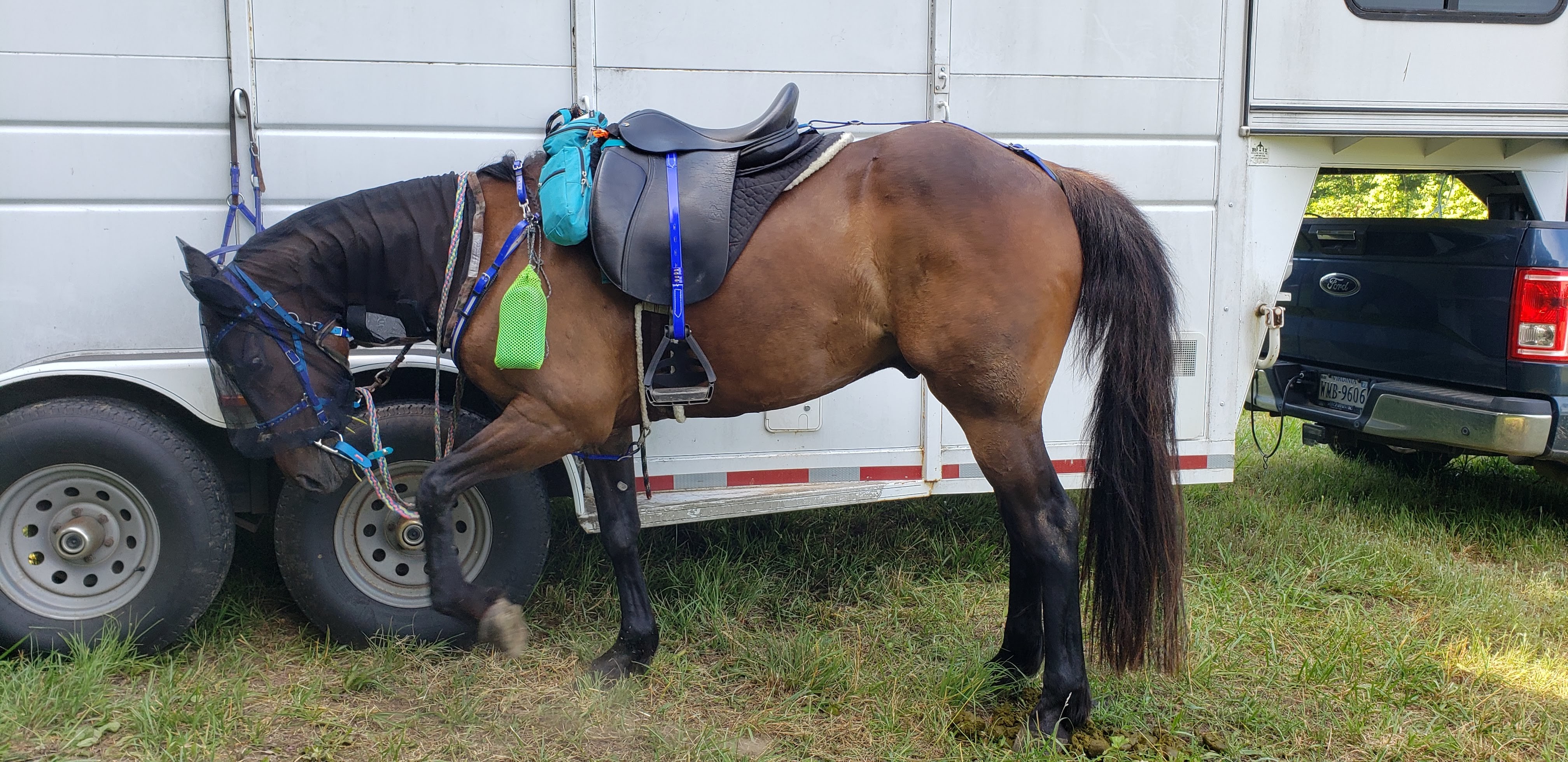 His shoes are still a learning curve for the new farrier. We’ve had some issues this cycle, but appears to be under control. He decided to be lame over the set of his RF for one ride (got a mile in, and then I hand walked him back) and then we found the Blue/softer Blue Pegasos shoes were too flexible for his hinds as he ripped those out in his twisting movement after 2 rides. We have also found a way to reduce the dramatic head tossing over flies (even with a bonnet), a Horse-hoodie! Unfortunately I discovered it makes it harder for me to grab mane if I need it, but hopefully won’t need to do too much of that once all the saddle stuff is dialed in.