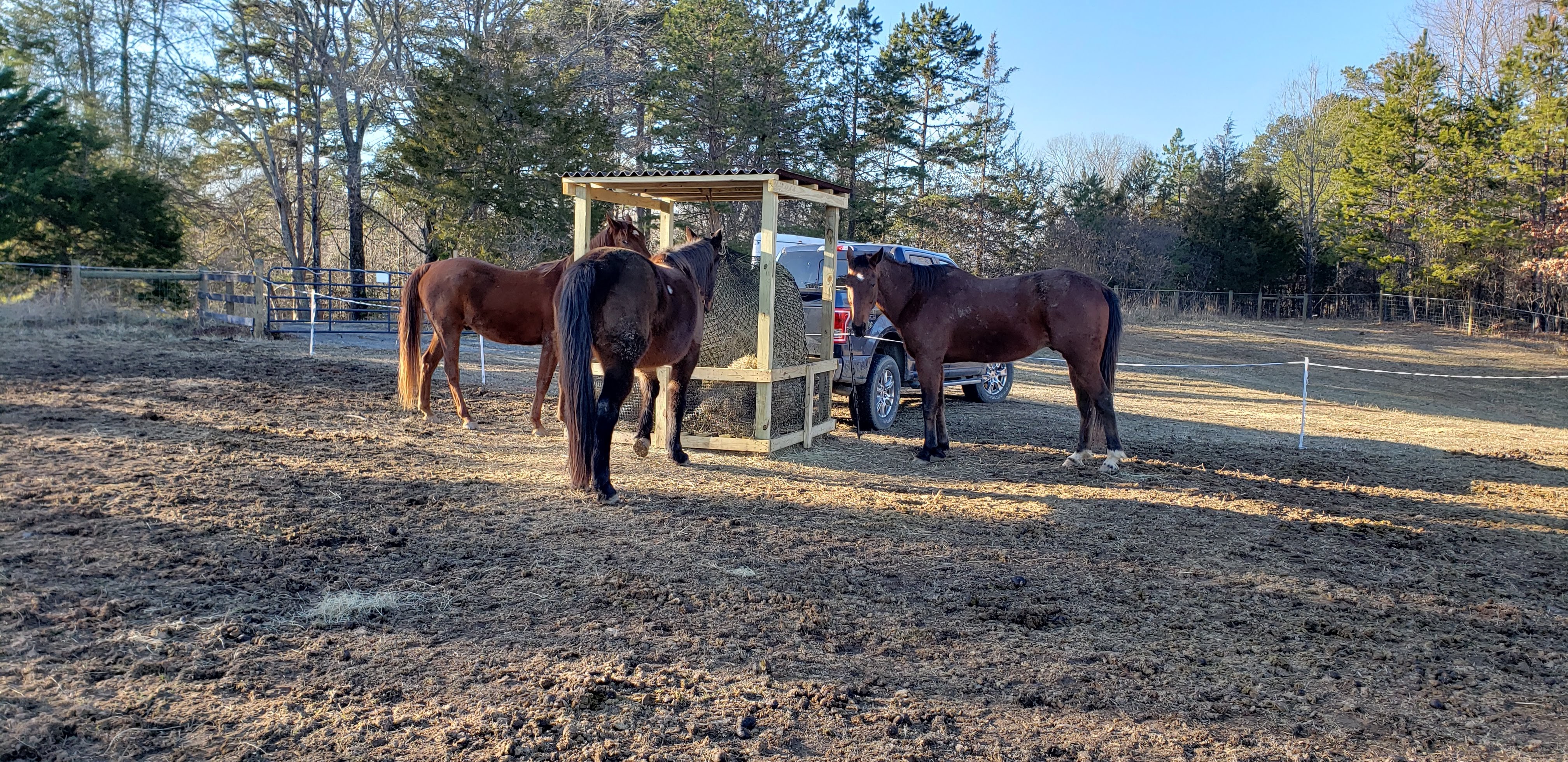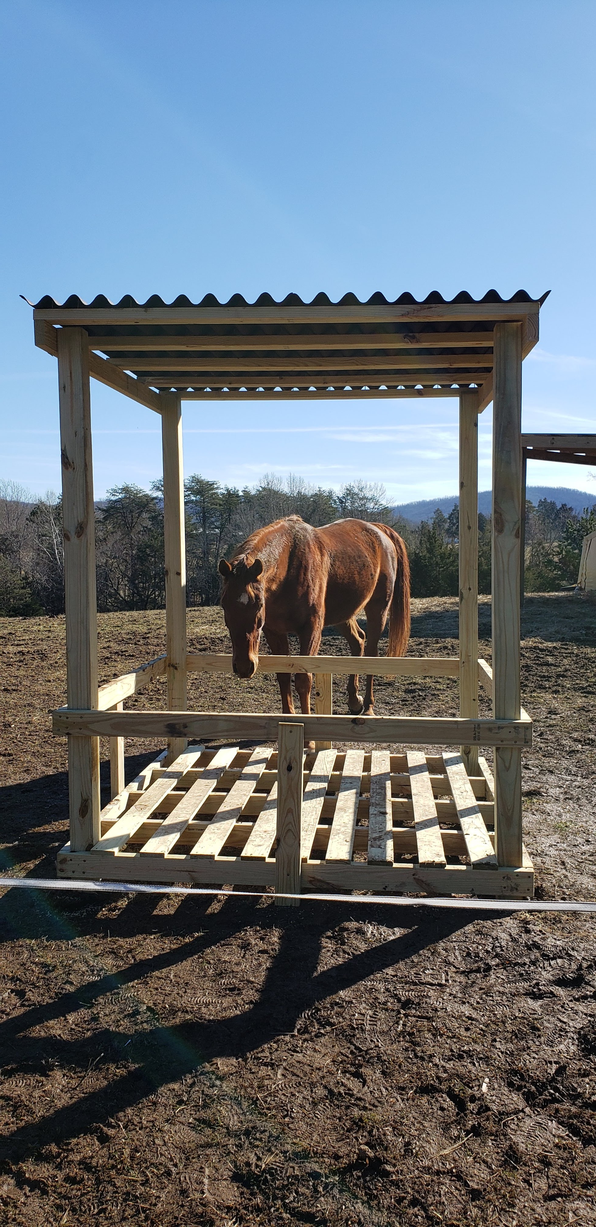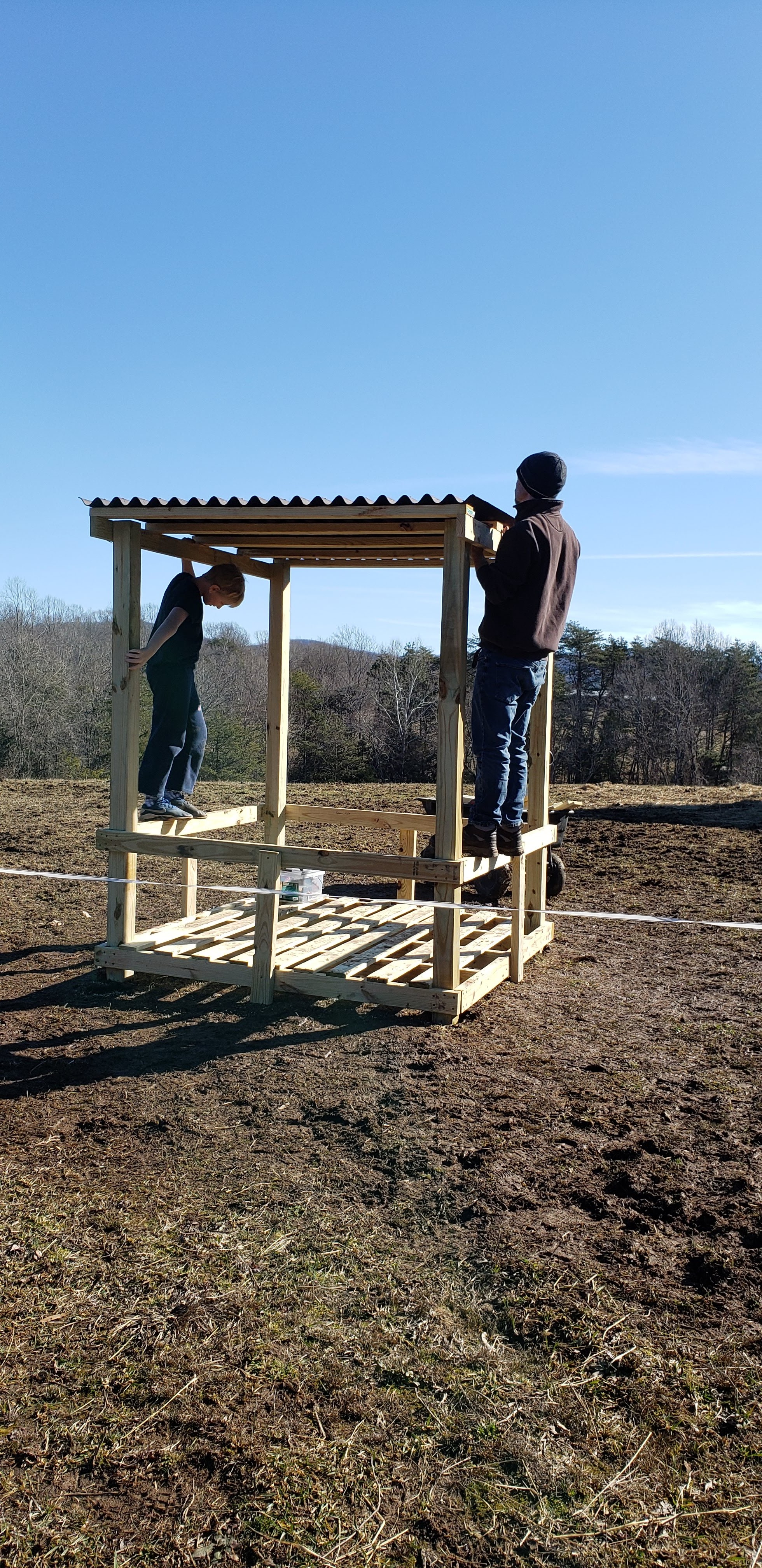 We built they hay feeder! The whole family chipped in helping to cut, hold, screw and nail pieces together. It has worked out nicely to keep the hay net off the ground and all of it more dry. One modification we made already was to make one side removable, as I needed to drag a bale out that they didn’t care for. Next steps will be to add another row of wood around it to keep the netting in better, add some more planks or solid piece to the bottom to prevent the small stuff falling through, and finally once dry enough we will jack it up to put skids on and make it moveable.