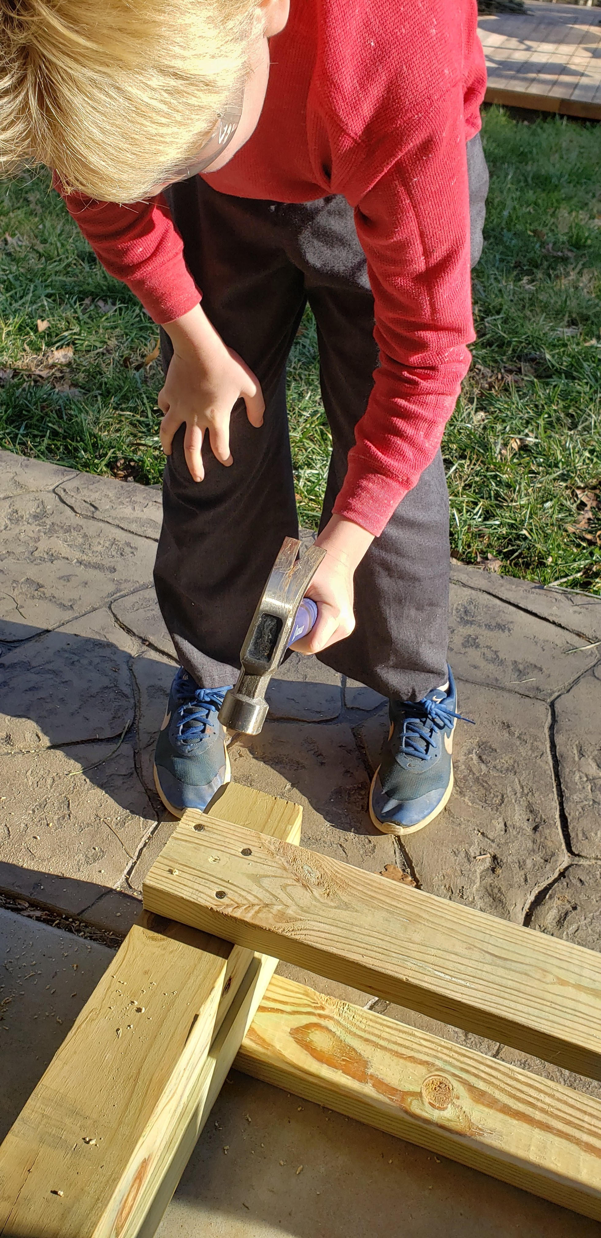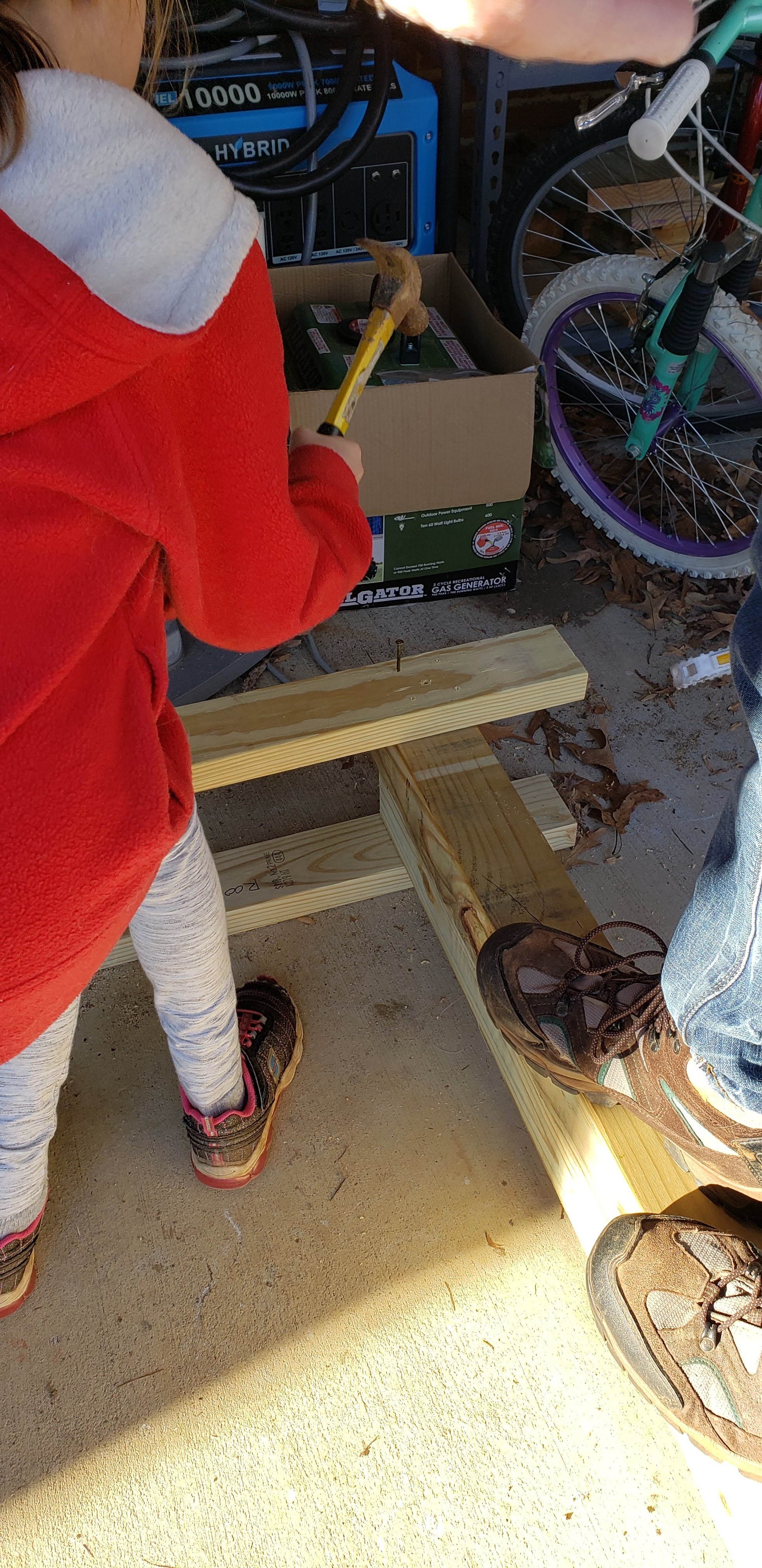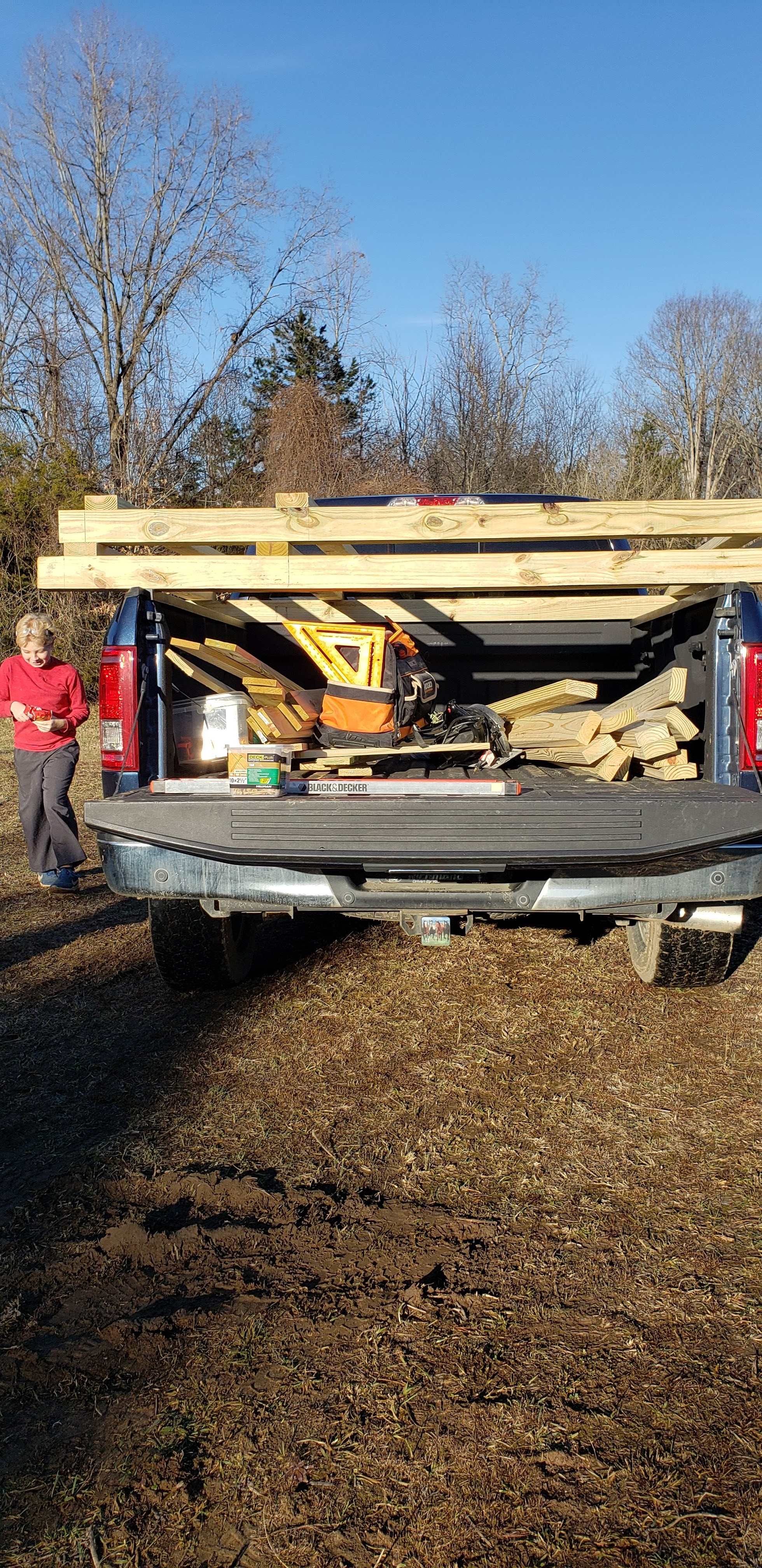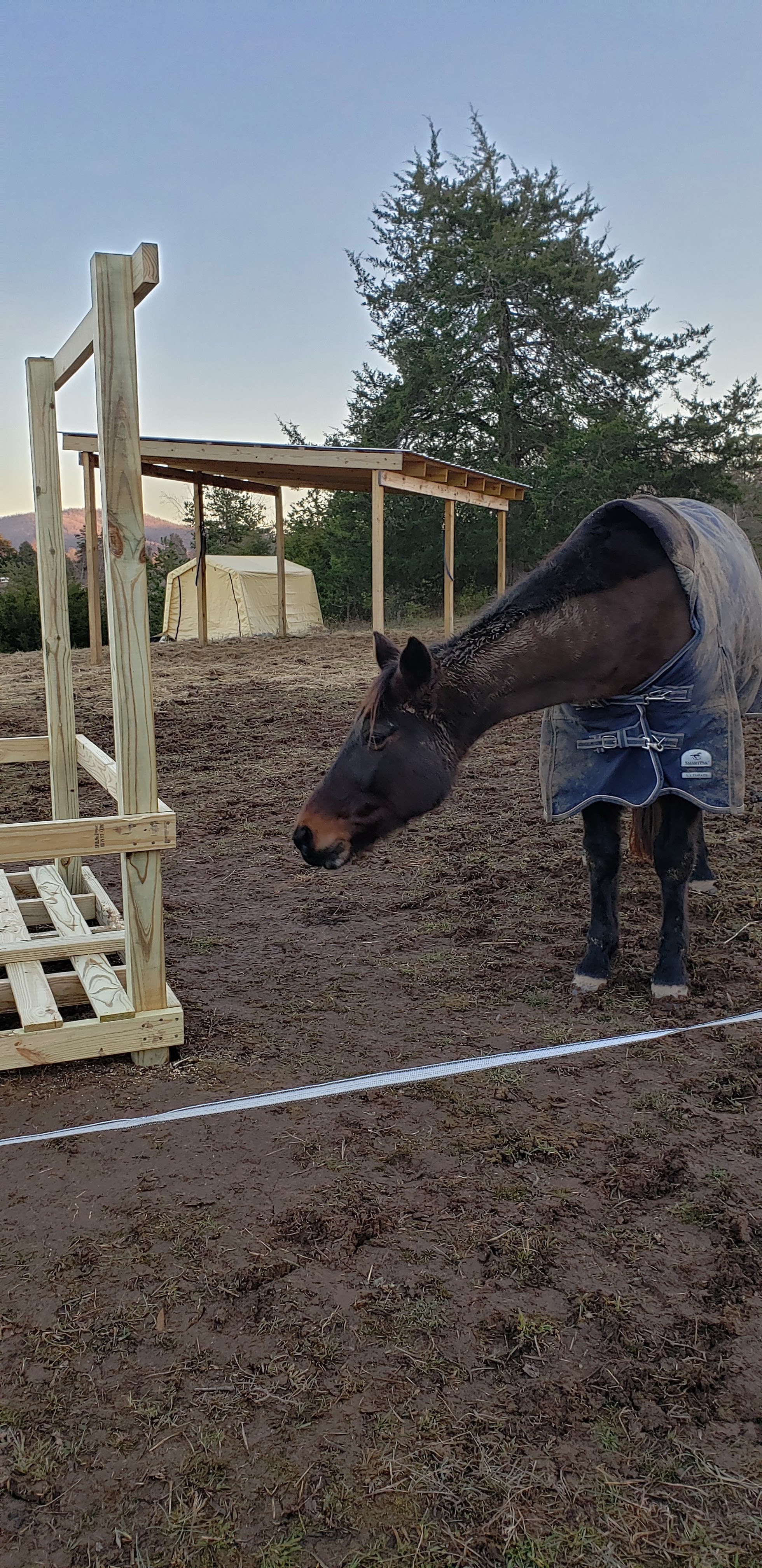 We built they hay feeder! The whole family chipped in helping to cut, hold, screw and nail pieces together. It has worked out nicely to keep the hay net off the ground and all of it more dry. One modification we made already was to make one side removable, as I needed to drag a bale out that they didn’t care for. Next steps will be to add another row of wood around it to keep the netting in better, add some more planks or solid piece to the bottom to prevent the small stuff falling through, and finally once dry enough we will jack it up to put skids on and make it moveable.