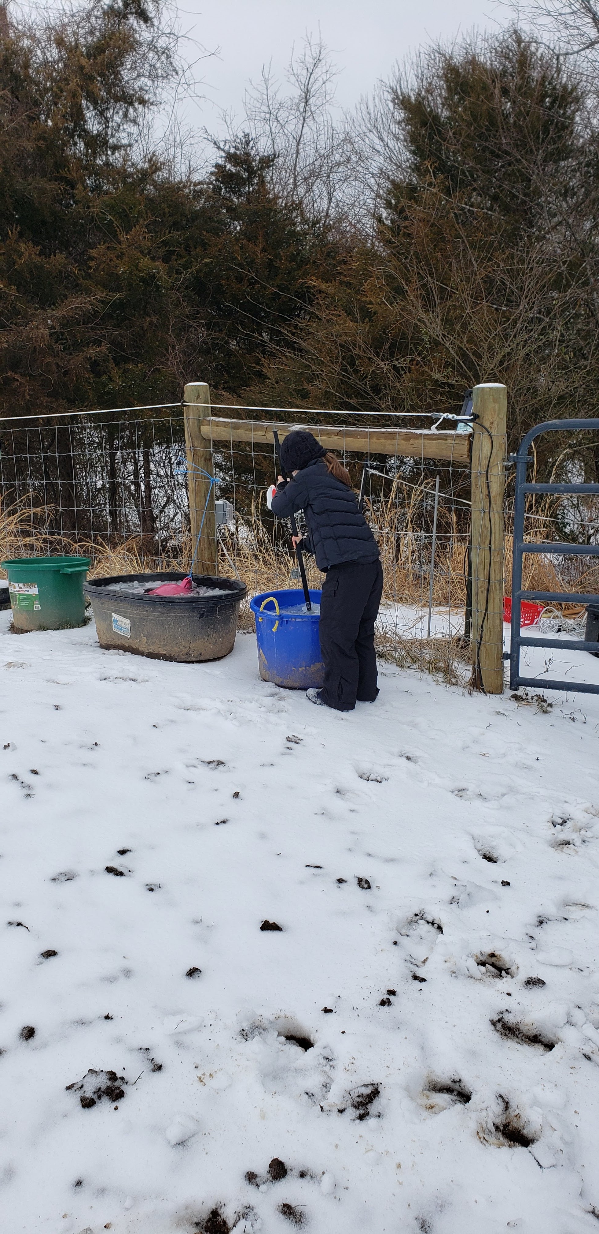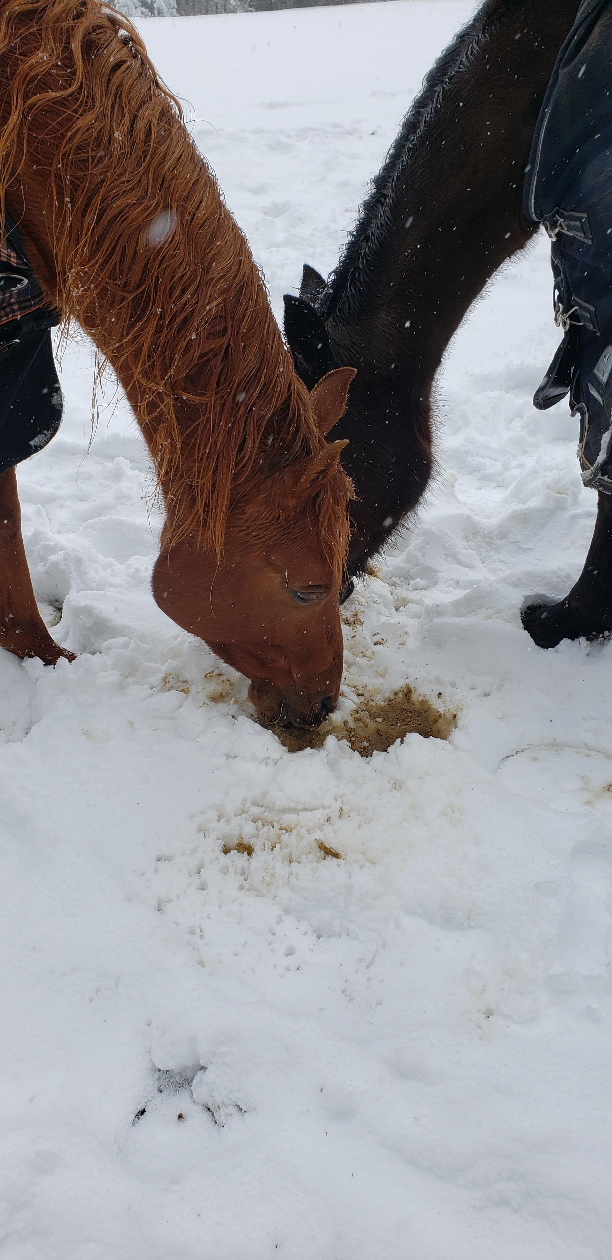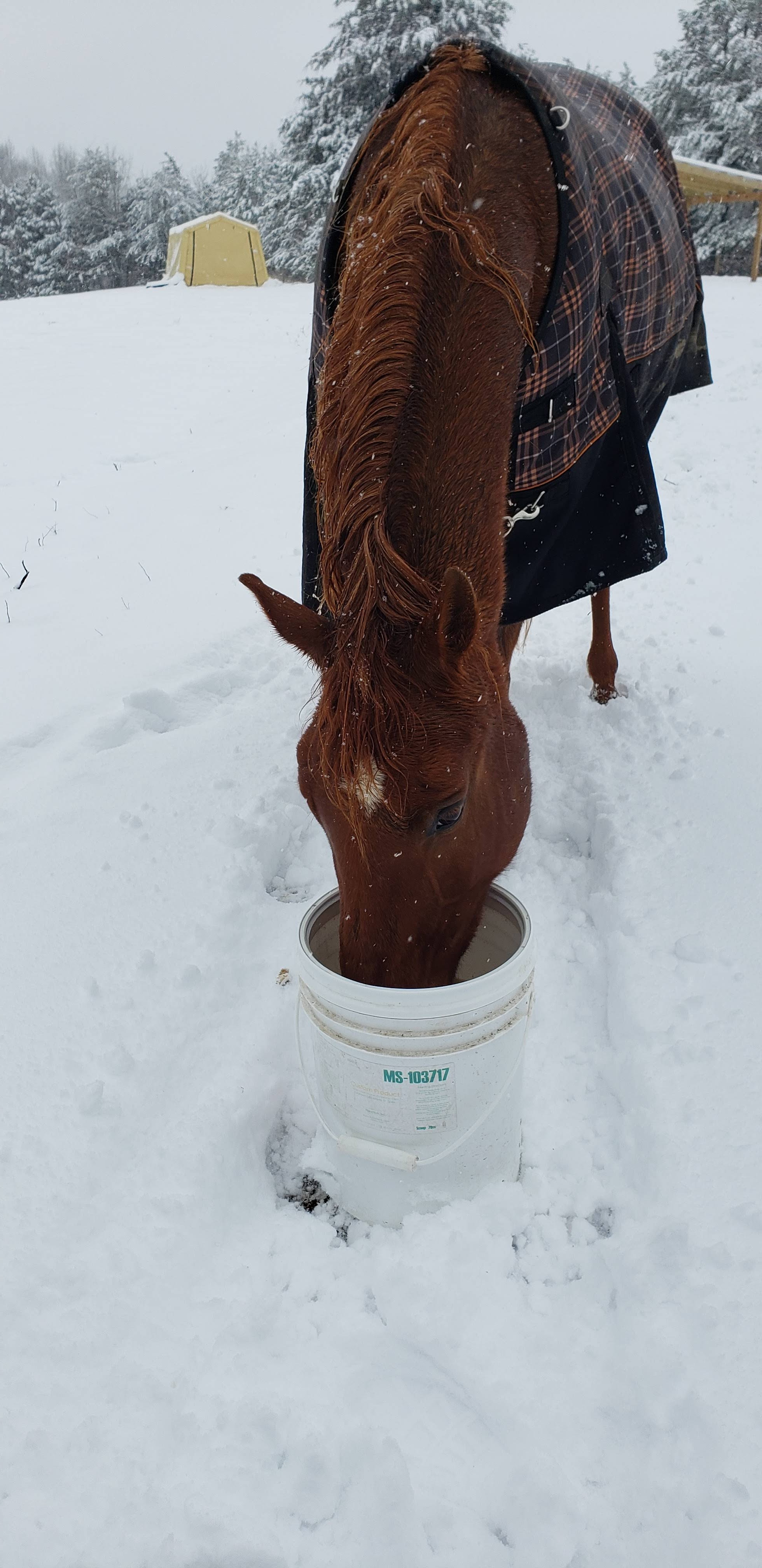 But you can see we have had some fun times playing in the snow too! Sully is still not drinking from a heated bucket or tank after he was shocked during the first ice storm we had this season, which means leaving water unheated it freezes over night. Currently there are 3 different water sources out there for them heated and not, and I’ve also been hauling hot sweetwater out them during the weather snaps, especially at bedtime, to ensure he drinks. Both of them seem to enjoy their soupy meals and special tea drinks! The kids have have to help me with getting the water out the past few days – that hill is deceptively tough to get up with the cart and water normally, let alone once there is an icy coating!!