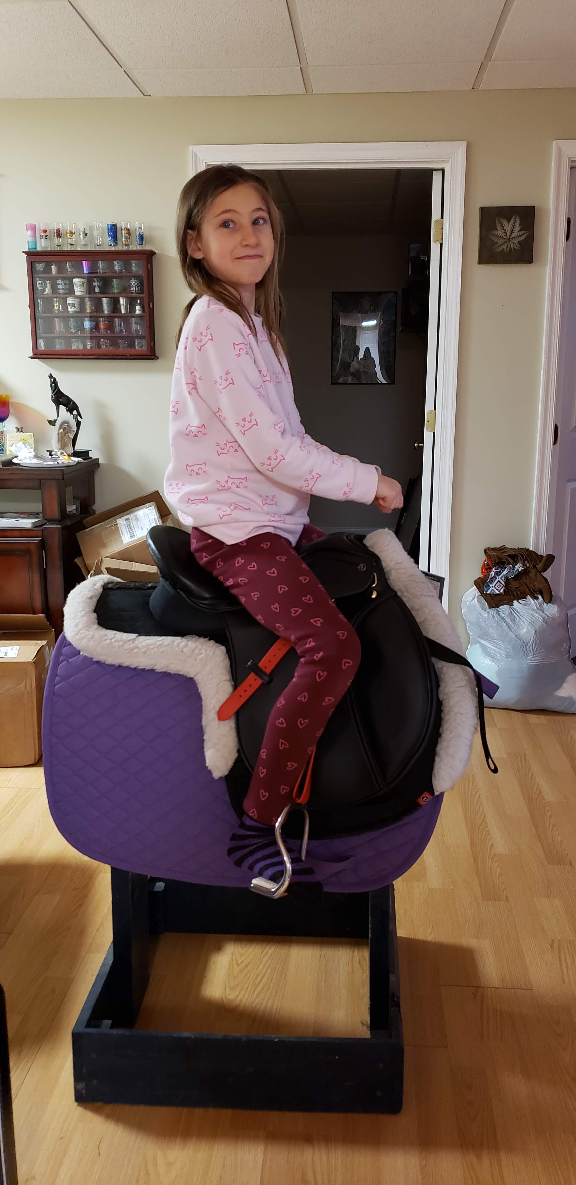 Skyler has her own saddle now (picked out with the help of my fitter to ensure it will be able to be adjusted for any horse’s use as well as fits Skyler), decked out with her own red beta stirrup leathers and safety stirrups.
