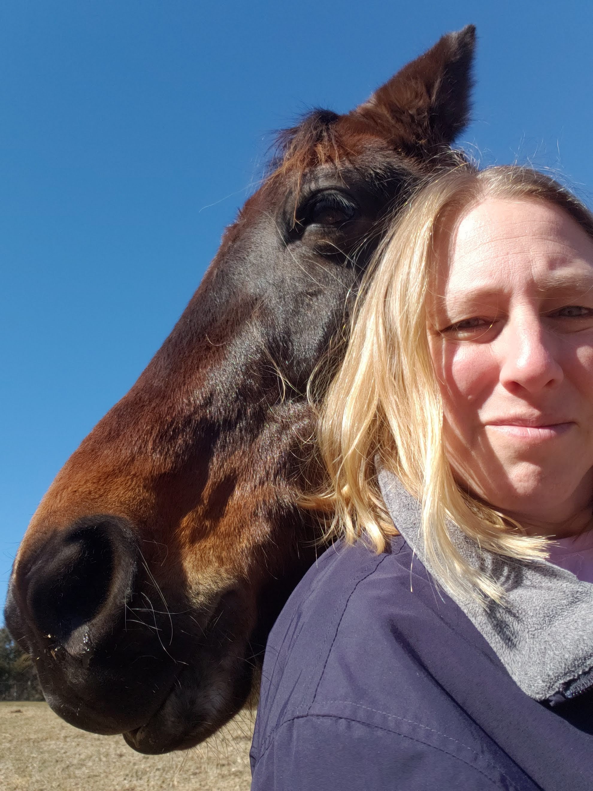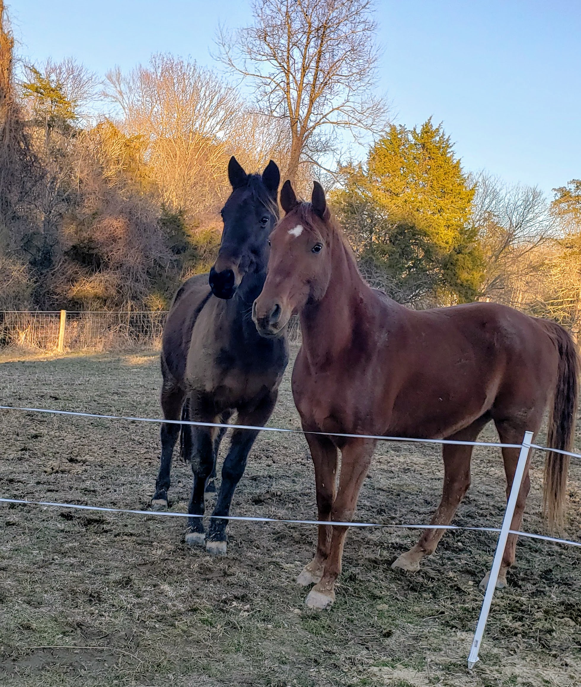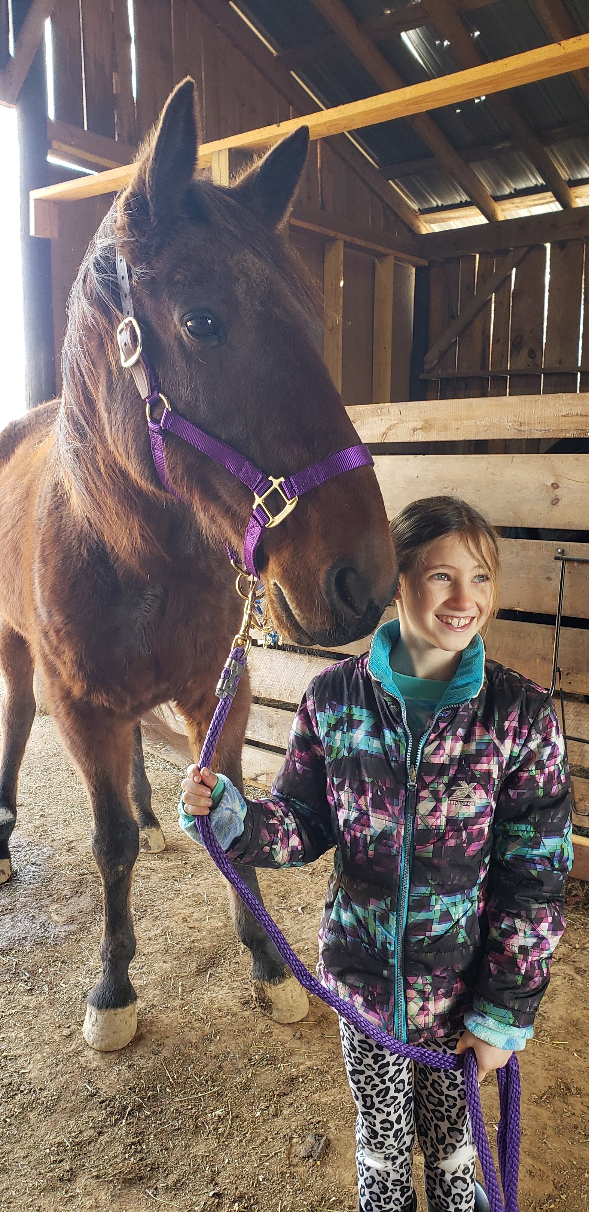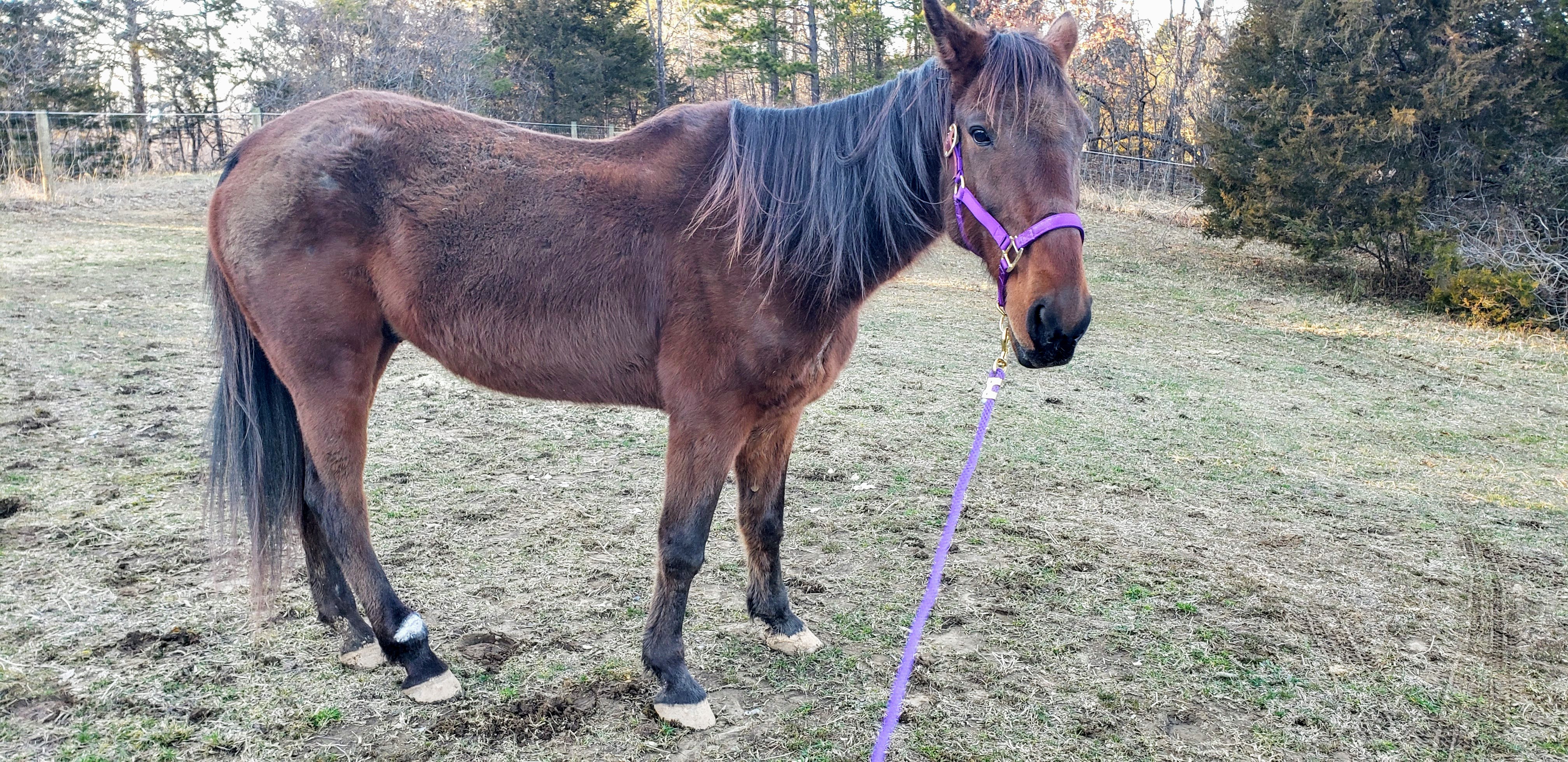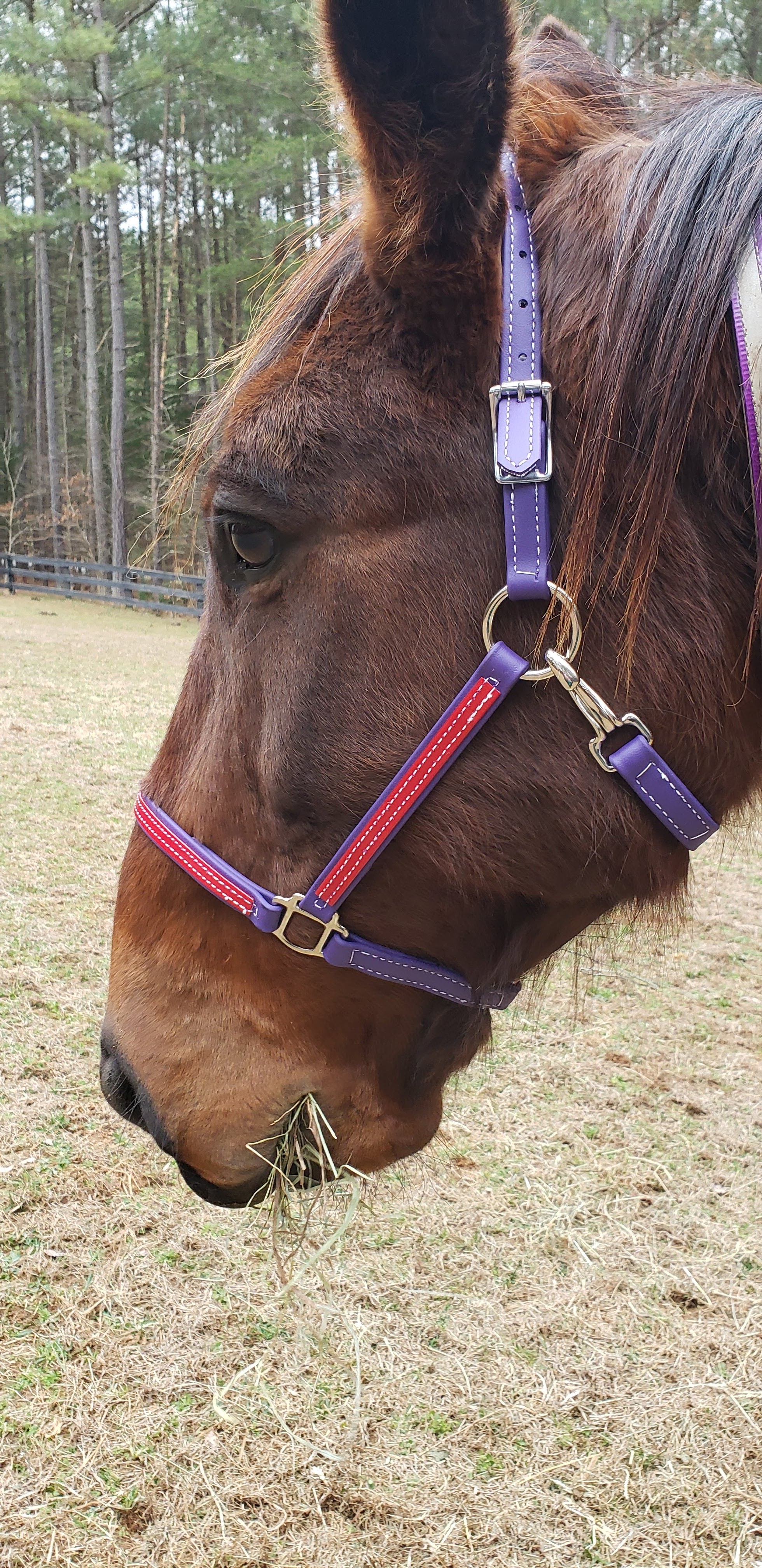 In other news, Skyler and I took a (long) day trip to NC to try out several standies available from SRF at New Journey Farm. She rode a range of them starting with 14.2h, then onto 15.2h, 16h and finally a 16.2h horse! She fell for a 16h gelding, aptly named “The Future.” He raced as a pacer until 2014, but trots under saddle. I took Friday off work the next week and we went back to pick him up ❤ He’s been here at home about 3 weeks now, she is still smitten, he is slowly putting weight on, the wound on his hind leg is healing, and he is continuing to settle in. She’s ridden him a few times in the pasture and being led down the road and he is so sweet. It appears he had some type of cart/buggy accident to cause the wound on his hind fetlock, and I have found scars on his knees and a pastern that could also indicate a fall. Sadly, his injury and lack of treatment of it, is likely why he ended up dumped in a kill pen/auction. He will now always have a large hind fetlock, and the scars will be there, but they do not hinder his riding and he isn’t lame/sore on anything. His hooves of course are also in need of correcting, with signs of multiple prior abscesses still in process of growing out. He is a very kind and thoughtful horse that I look forward to seeing bloom! His & Skyler’s “colors” will be purple and red (that Beta halter is being adjusted to a new size as it is too small!) and we think he looks sharp as it all comes together.
