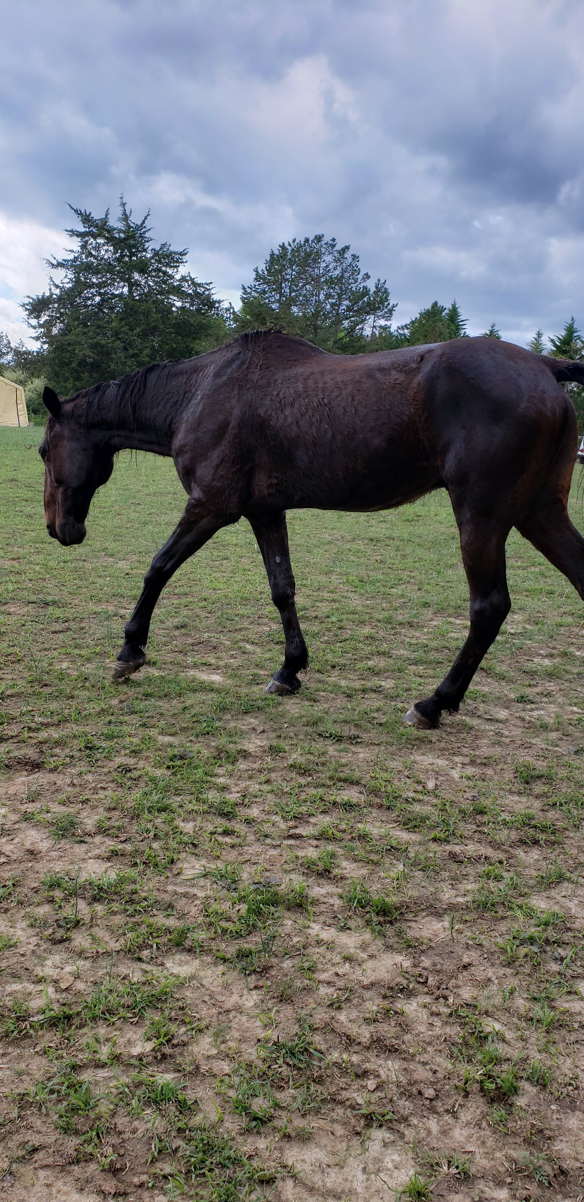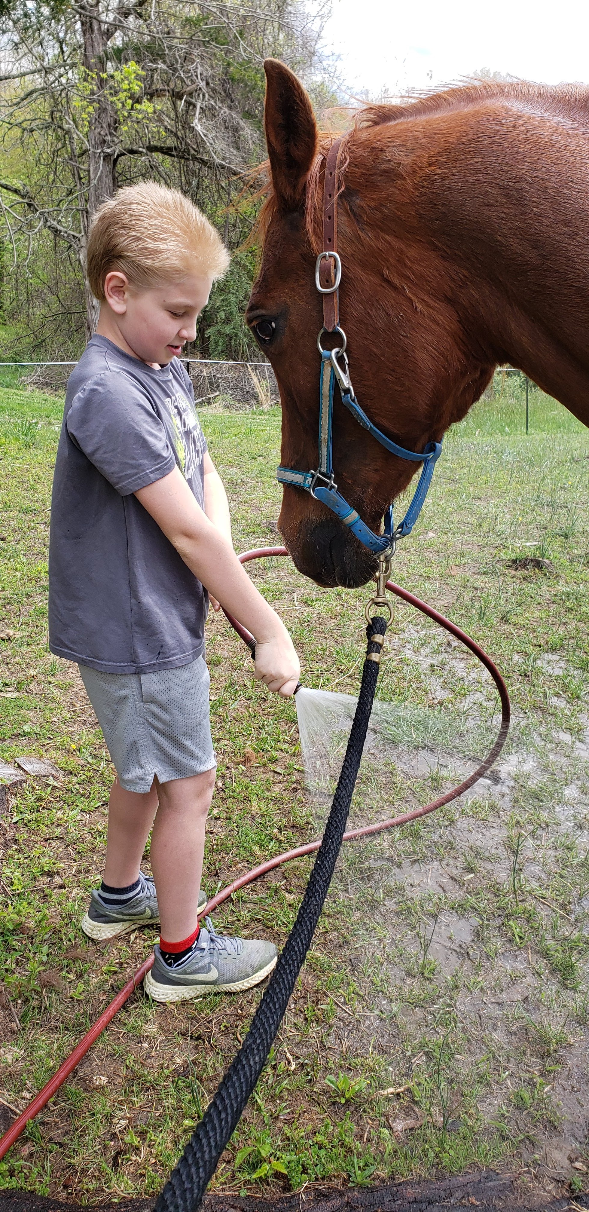 Prophecy is his goofy self and doing well. He came out of winter with rain rot again, despite diet tweaks. At this point I’m thinking it may just be a part of his IR, and that I don’t use a water filter on the hose in winter so may need to up his Cu/Zn next winter to further counter the Iron levels. He and Future (who came with rain rot from the pen) both got a bath Sunday afternoon with Equiderma to treat it and help with shedding. They will get another bath on the next hot day as there is still more grime to remove.
