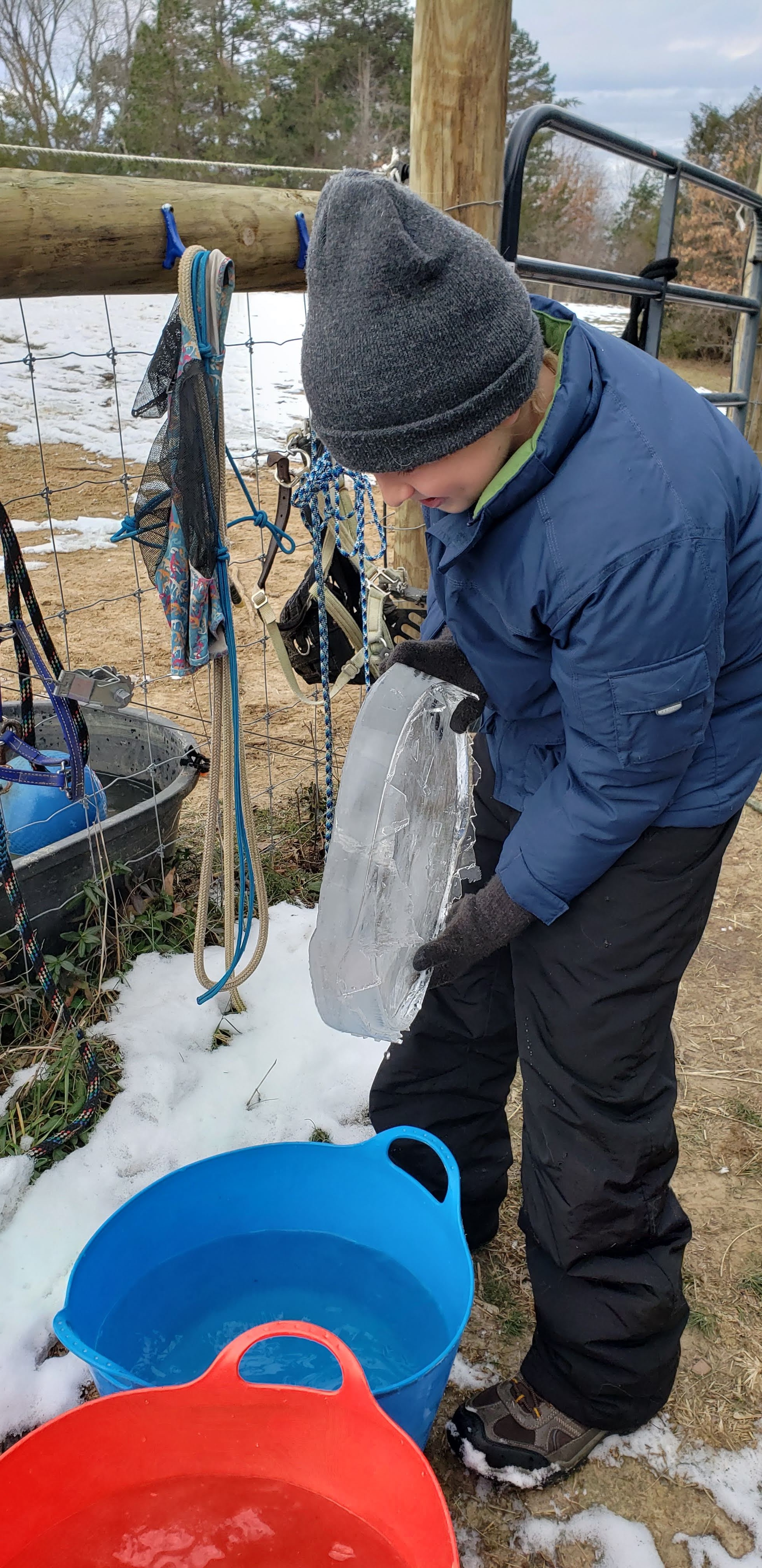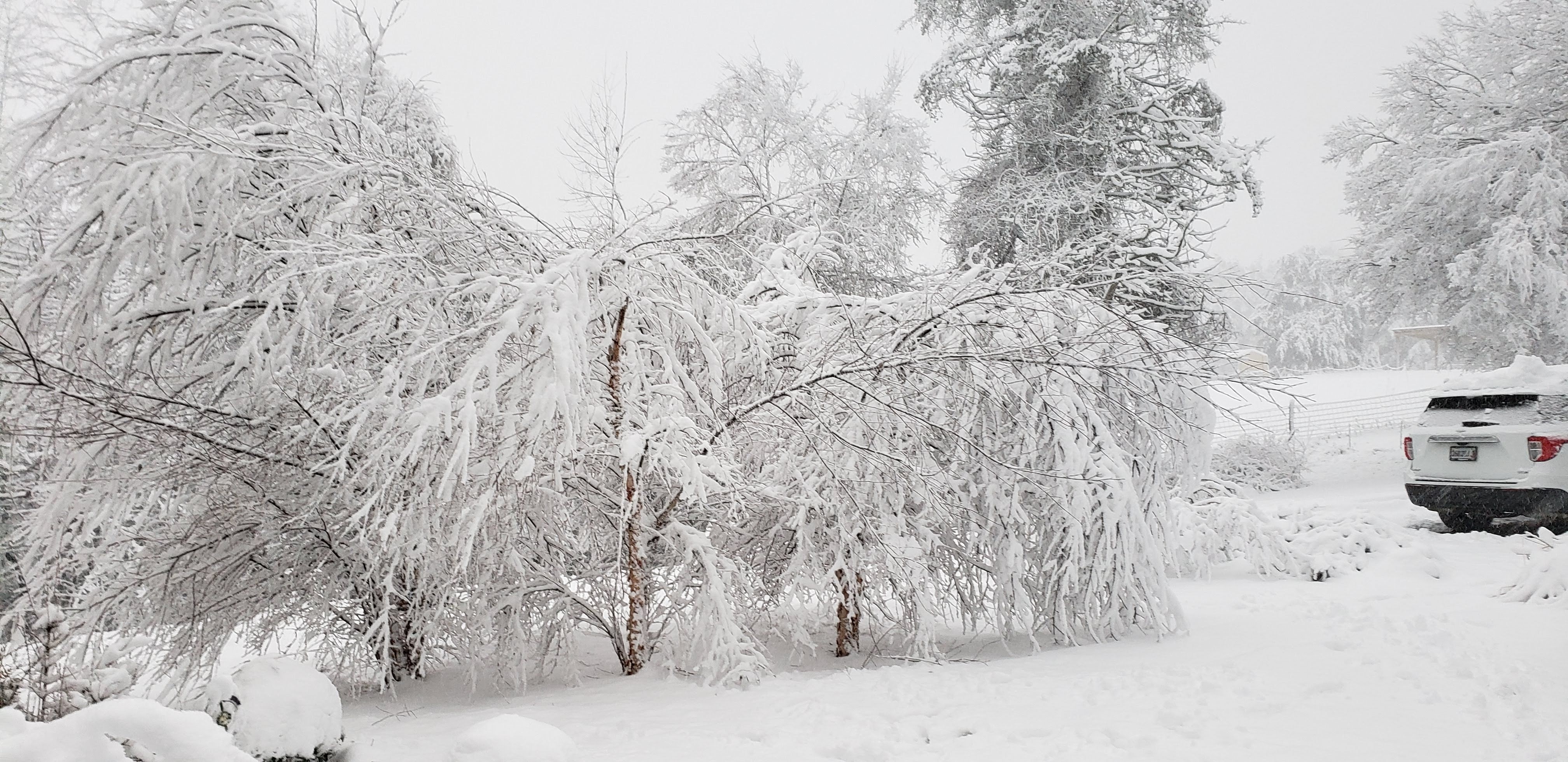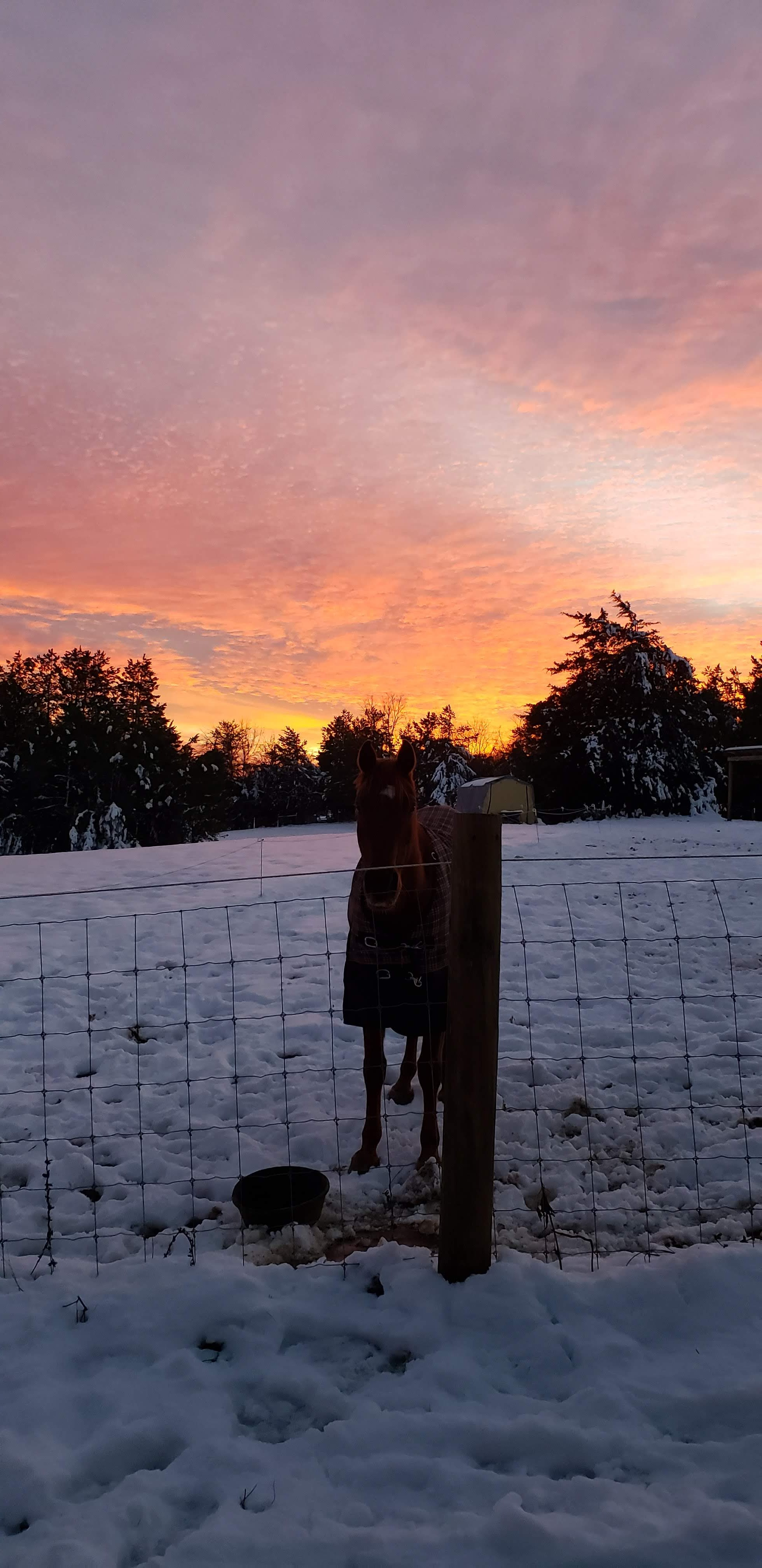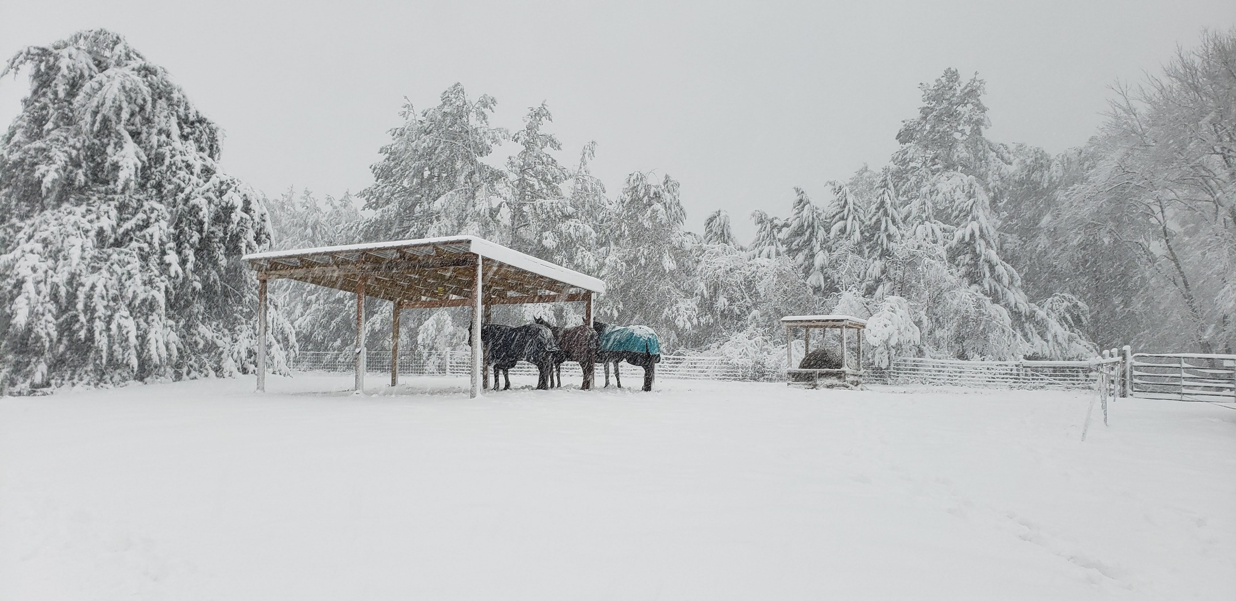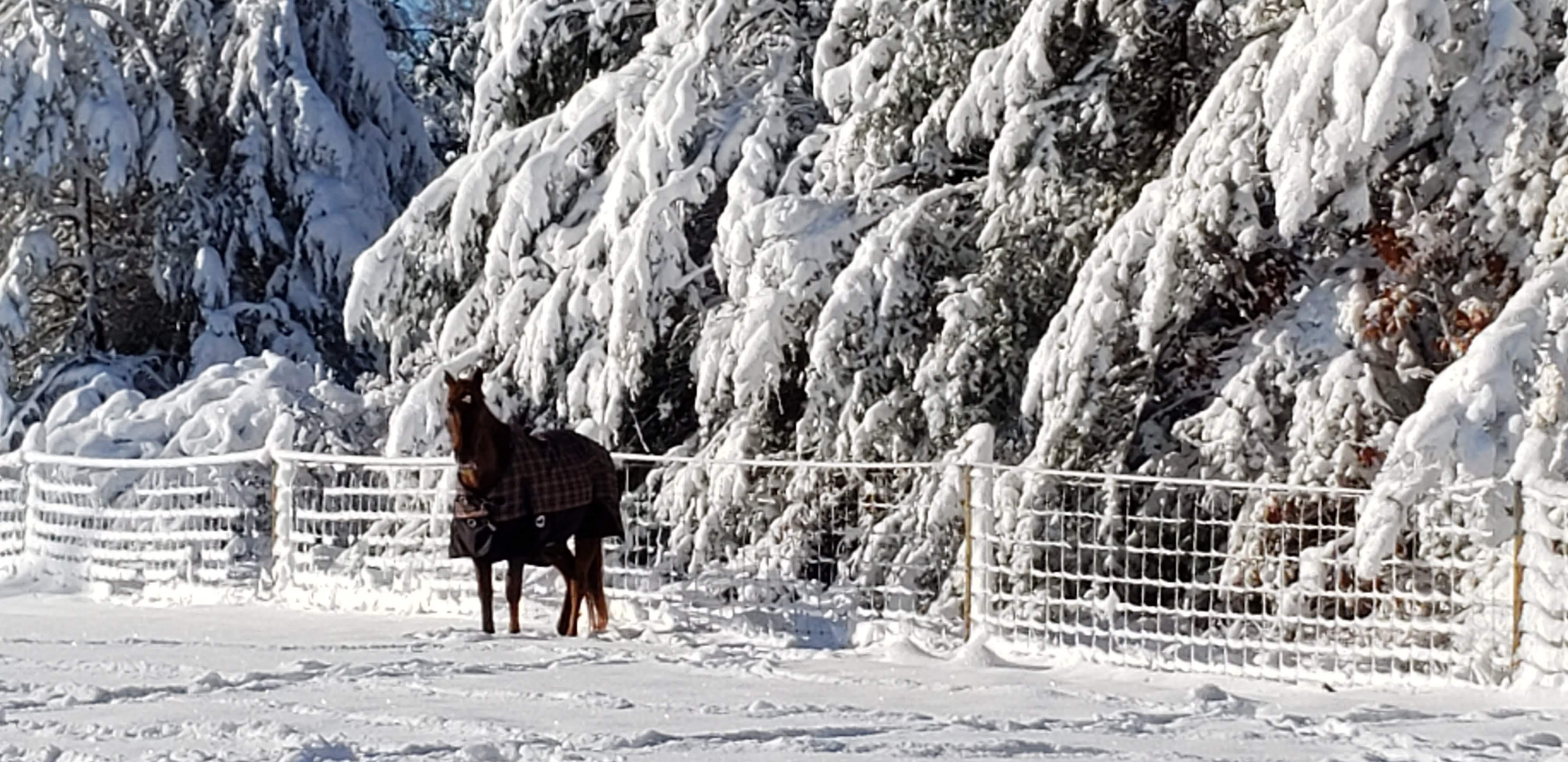 We ended up deciding to leave even earlier (230am vs. 4am) when heading home and it ended up right about 15hrs with minimal slow downs (in NC that time!). Forecast was showing some snow starting as rain Sunday night/early Monday (still a holiday) so I raced around getting out a new round bale and blankets on once back. It had been warm the whole week we were gone, and was still 60degrees at 8pm when blanketing. We didn’t think much about the 4-8″ claimed to arrive as they are usually very wrong… for once, they were mostly right! At 430am when I looked outside during a bathroom trip there was nothing happening. At 730 when we woke again, there was 6″ of very heavy wet snow, and it was still coming down… we lost power at 8am, phone and internet shortly after. The truck had been scheduled to be fixed that morning but we called first thing and agreed to reschedule to Friday. Thankfully we have a generator, and a 100gal propane tank that feeds it with a line into the house. Minus a bobble in things later on Monday (needed oil), it performed flawlessly. We figure it was about 9″ at our house in the end! We played outside in the snow some and you could hear the trees cracking and falling all around. When I walked the field I found 4 trees on our fence 😦 One section is crushed and will require some repair, but first we have to get the trees off to turn the electric back on.