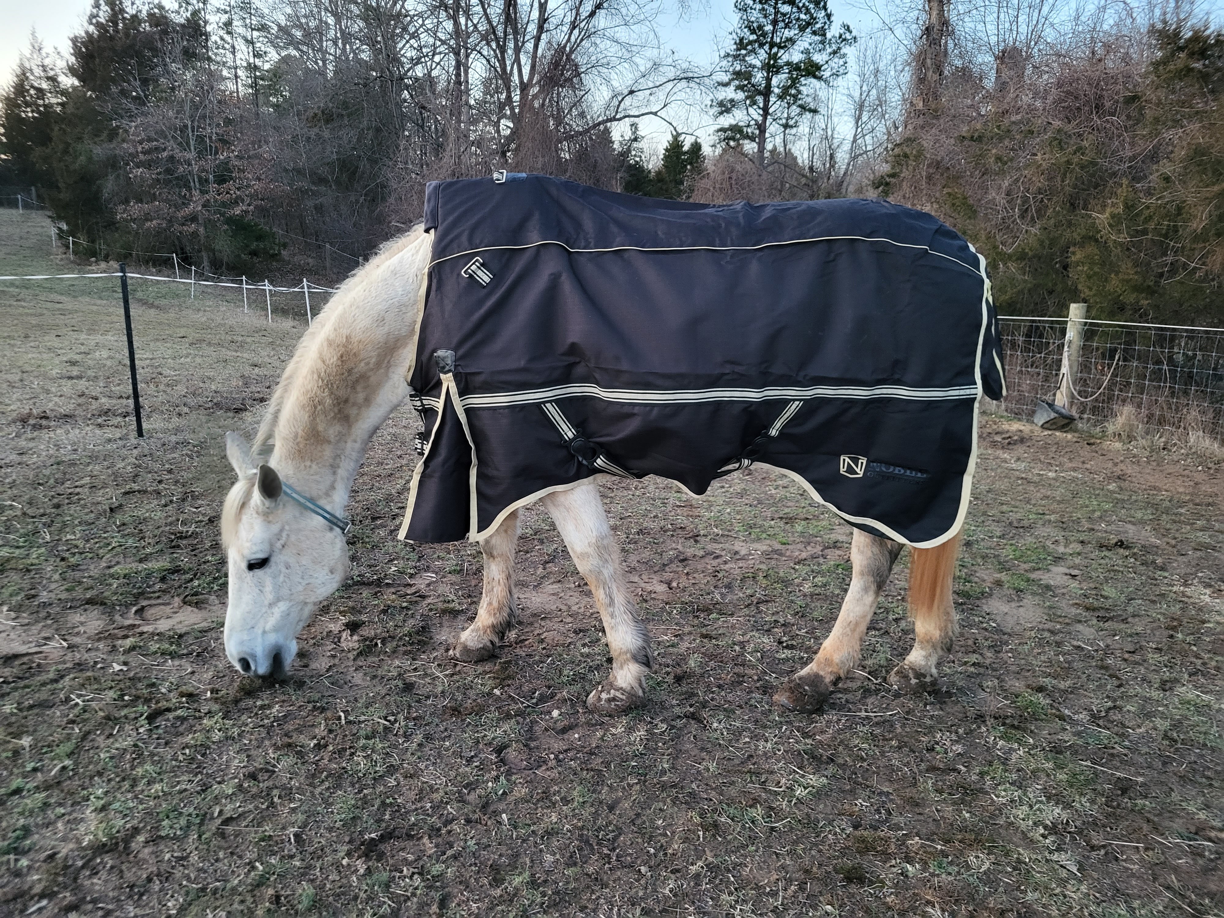 They had taken horses from this pen/rescue before and not had any major illnesses so she felt confident using the isolated paddock for him would be QT enough. It had a shelter, view of other horses, and no competition for food/hay – just what he needed. Since he seemed “Scooby-sized” I brought along the size 78 Unicorn rain-sheet for Breeze as the weather had been (and still is) nothing but cold & wet, no snow 😒, interspersed with warm days (and I had gotten Scooby a new rain sheet with neck recently so the unicorn one was “extra”).