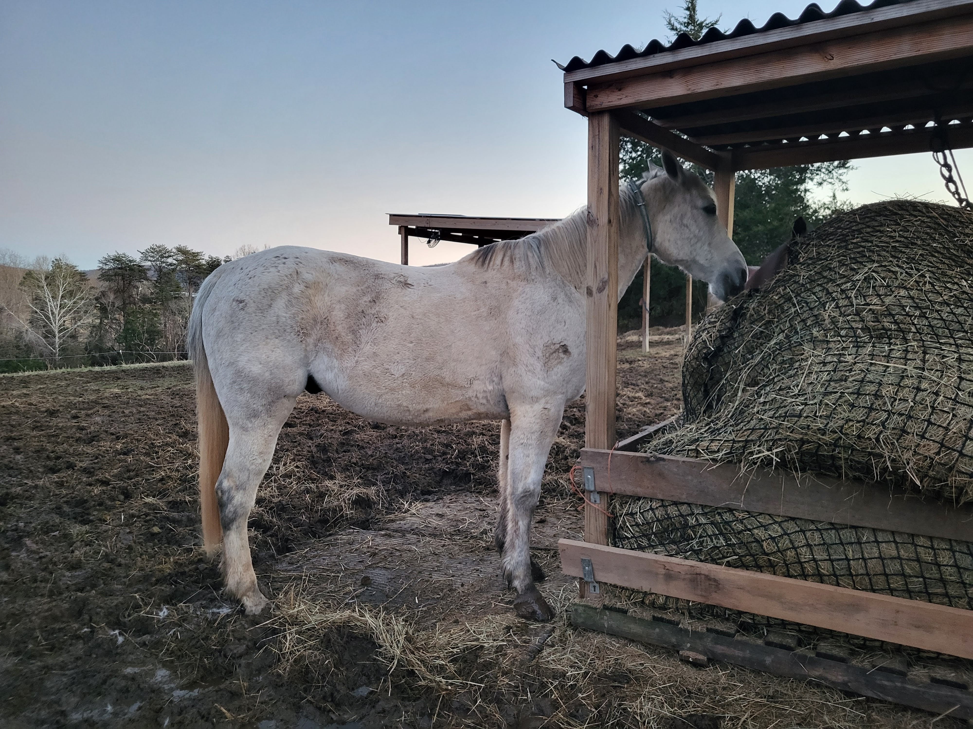 When we got home the other 2 boys happened to be on the inside of the track grazing the section, so Breeze got a chance to explore and find them. They introduced nicely and non-dramatically over the fence line, he found the water tanks, got in a good roll and then went out in the pasture as well. Prophecy then made sure he and Scooby didn’t buddy up, and kept Breeze at a distance. Herd interaction is very interesting to see! Sully was our herd leader before – and he wasn’t one to chase. He put Prophecy in his place when Scooby arrived, making sure that he wasn’t bullying Scooby away from people or the hay. Now… Prophecy is the boss; Scooby a solid #2 and Breeze on the bottom. He doesn’t seem to mind, though will turn his butt to kick back if needed. There has been issue around the hay feeder, which resulted in me having to change the fence setup over there to allow for all 4 sides to be accessed. Unfortunately due to our soaking weather, that has meant they have trashed the driveway for the trailer 😭 Now I’m working on how to get that feeder moved, so I can reset the fence, figure out if I can move trailer without getting stuck, and then have more gravel put down there, and probably where the feeder is suppose to go/will go back to too.