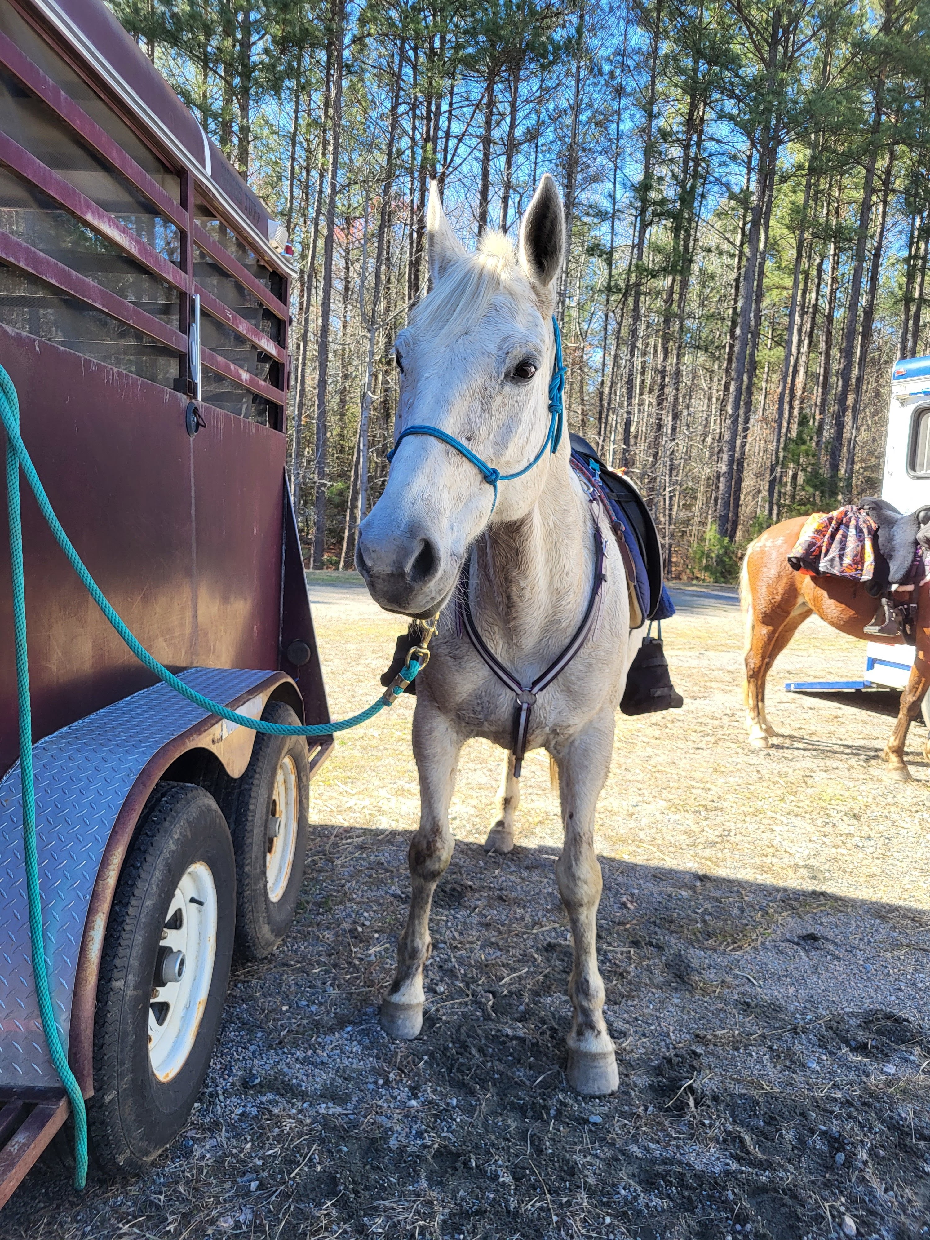 Finally it came time for me & Skyler to be able to go out together with the larger group. We embarked on our first trailering of both horses last weekend – Breeze was still antsy in there when we first were leaving, but he & Scooby didn’t quibble at all. So a pretty smooth 1.75 hour haul to James River State Park, on another windy cold day! Both horses did great and Skyler was happy to have me able to hang back with her riding. Scooby definitely doesn’t do “more than needed” lol. He’s happy to mosey on down the trail and trot or canter to catch up. Both Skyler and I got to canter a little, Breeze even jumped a log on trail. I had to borrow a friend’s breast collar as his new tack got held up by USPS and wasn’t in on time 😦 But he has a stunning custom set now!