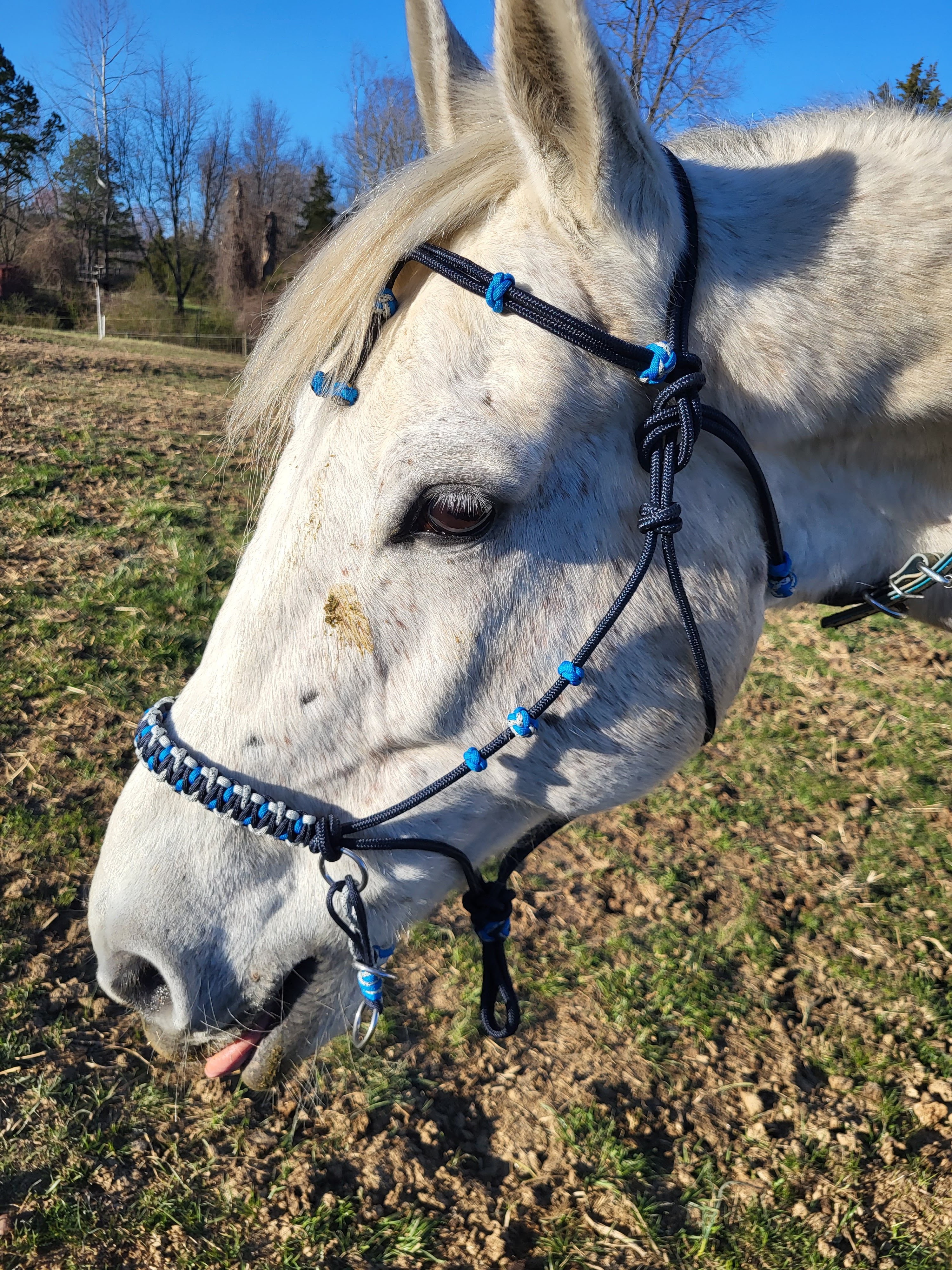 I finally got on Breeze at home after a few weeks in his new digs, shortly after my last post 😛 He was good, but of course distracted by being at home ridden in just a separate pasture from the others. I was able to hodge-podge tack together to make something usable – Traveler’s old bit hanger I still had, Sully’s rope halter (just barely fits), a girth that was bigger than Sully’s normal that happened to have as extra, my Nexus W saddle & pad that has fit most horses with a combo of JB pads, Skyler’s extra reins, and the bit I bought for him that was recommended by a previous owner.