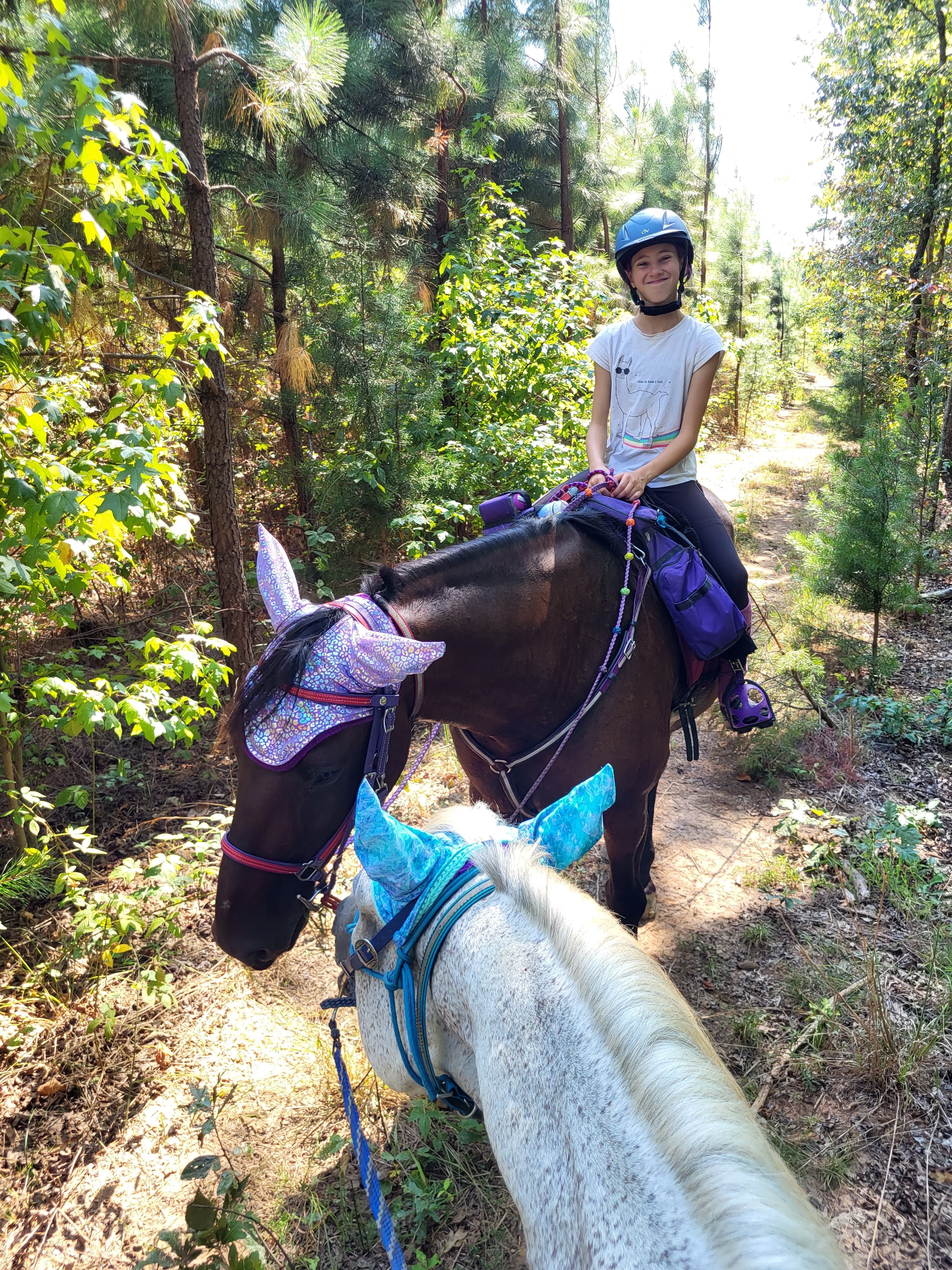 Since the above started, I’ve gotten Breeze out again with Skyler a few times. He’s still more reactive than I would like, but I’m finding ways to work through it. I’ve got a good sticky bum and sticky pants lol. He’s just a BIG mover, so if you are caught off guard at all, HOLD ON! (as he slams on the brakes, backs or side steps, or even teleports across the trail width)