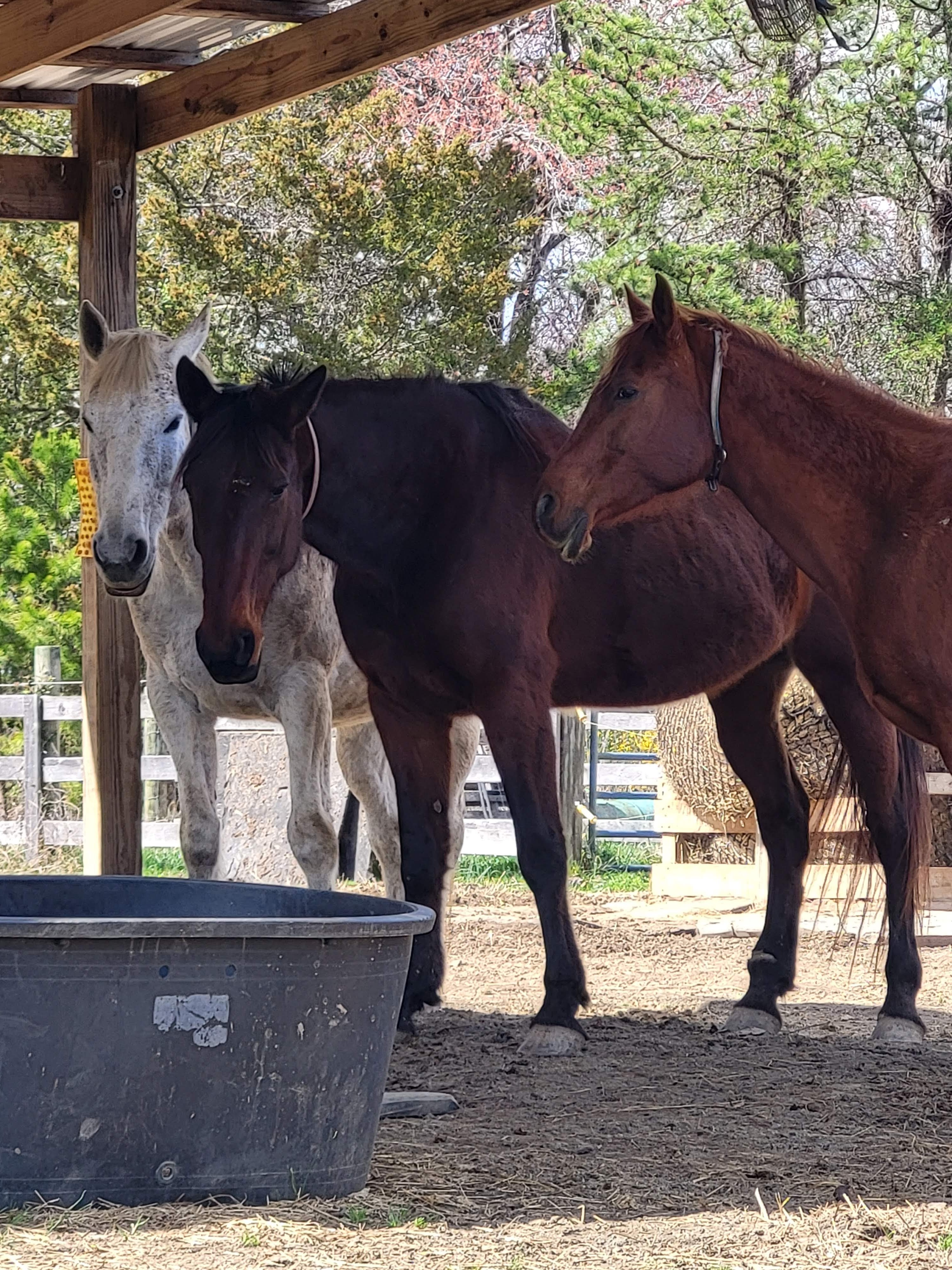 Scooby and Prophecy are doing well too. Prophecy is now in 24/7 muzzle time while I have grass areas open off the track. He quickly goes from “pregnant gelding” look from the winter hay to a reasonable body score but not muscled look as the retired horse that he is. Scooby kept weight on well this winter and is looking good this spring; all of them are still shedding and weather is bouncing from 50s to 80s 😛