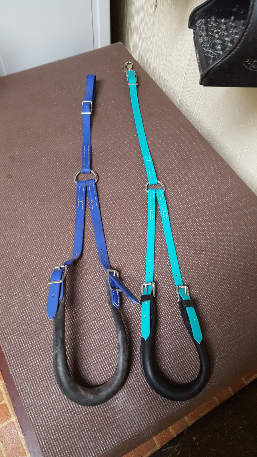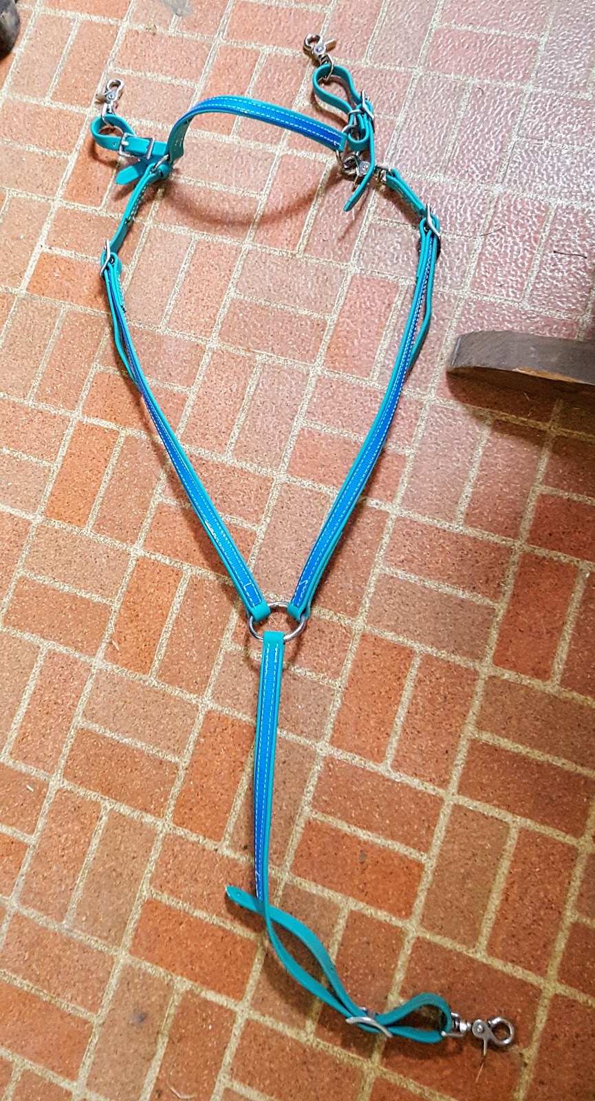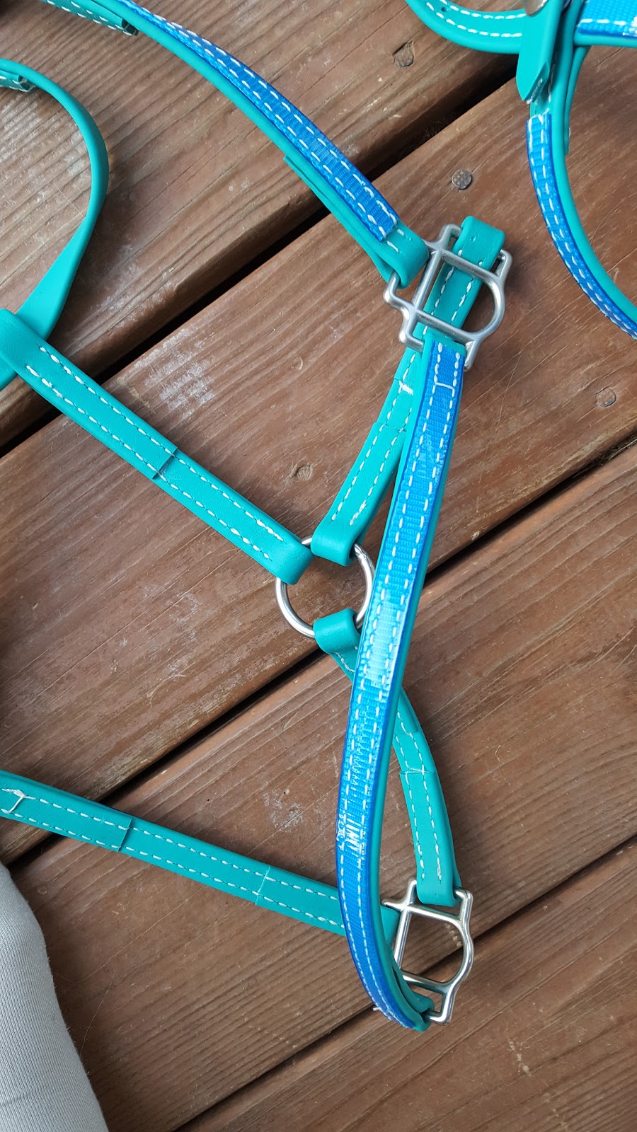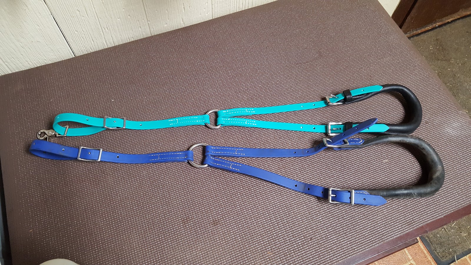 Crupper, just arrived. I actually have two Cruppers from THT ; the original is a Dark Blue one I bought for Tesla in 2015. Both of these are Arab size, but the Turquoise is available in a thinner beta than the blue was so it has a smaller build overall. The new one also has a snap on the saddle attachment that I can use for easy on/off, or use just the conway buckle like I have on the dark blue.