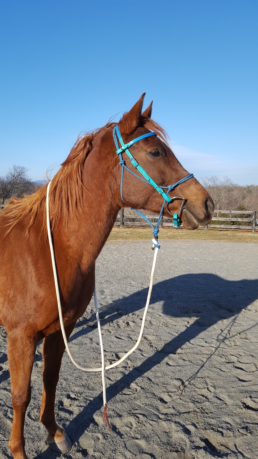 Here you can see him using the Snap on Bridle over a rope halter with the Curb Strap:
